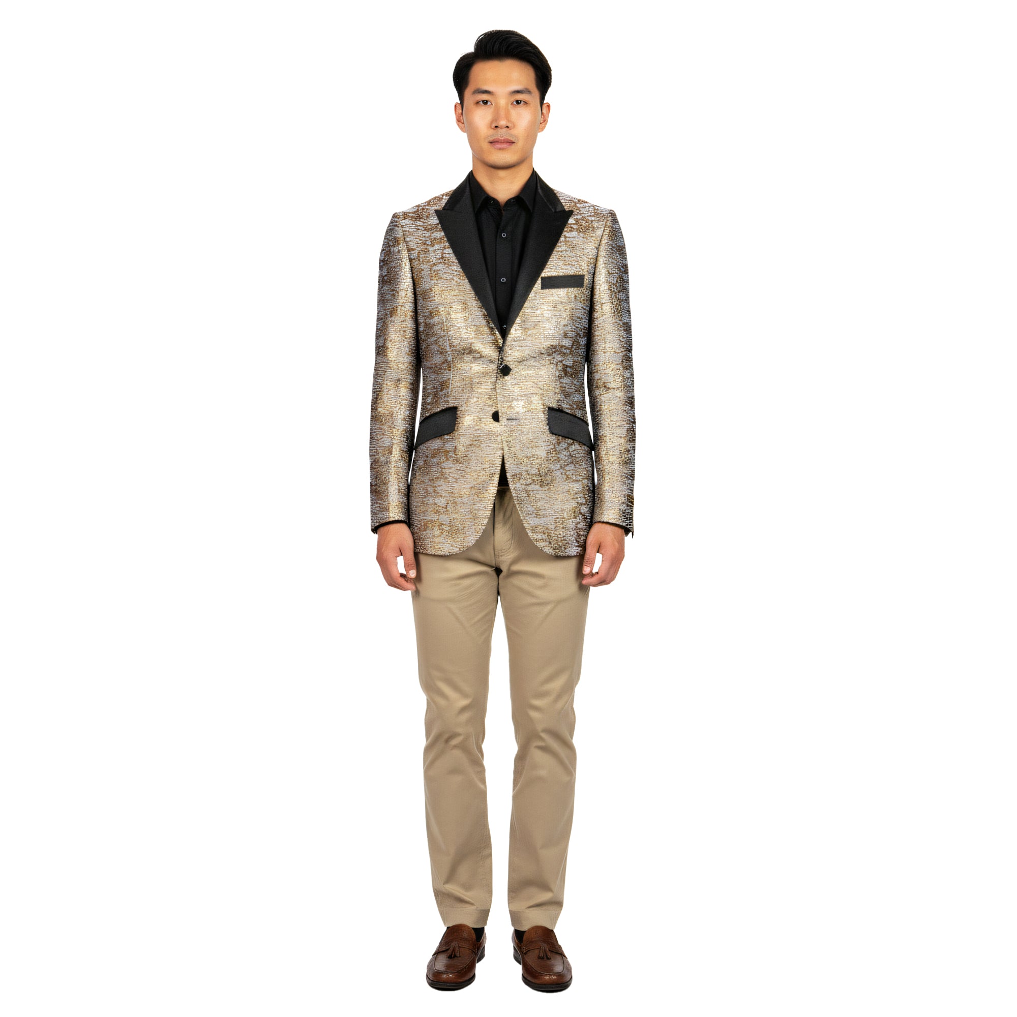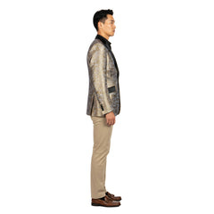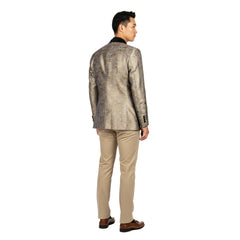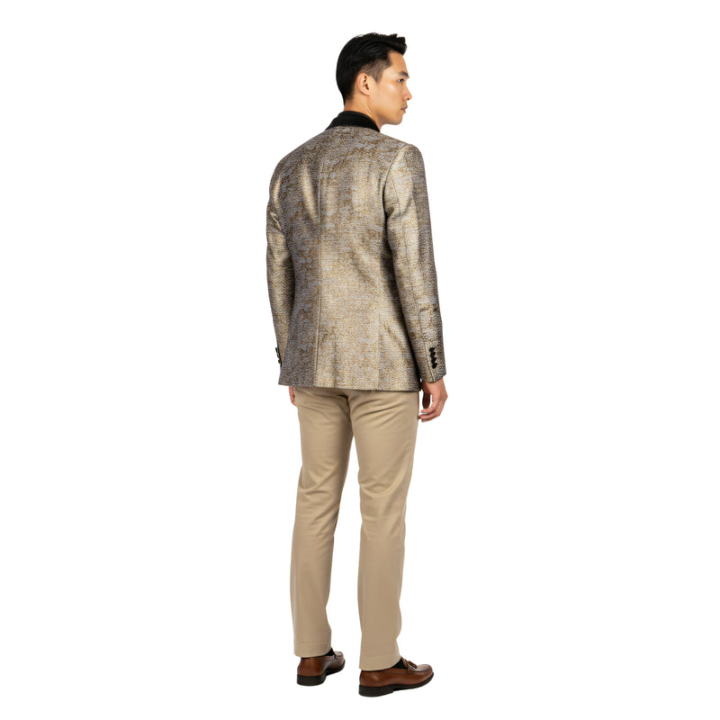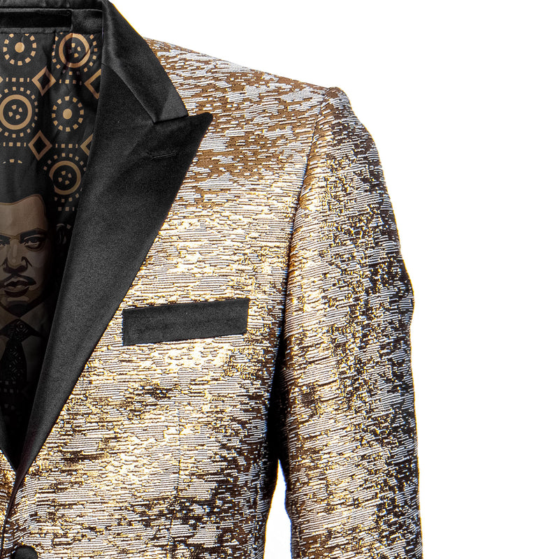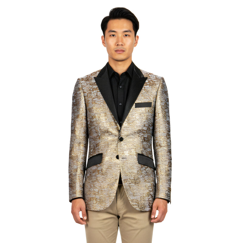urn heads with the Empire™ Textured Copper Dinner Jacket — a bold expression of modern sophistication and metallic elegance. The copper and black woven pattern creates a rich, dimensional texture that glows under the light, complemented by a sleek satin peak lapel and single-button closure for a refined finish. Designed in a Hybrid Fit to balance comfort and tailored precision, this blazer is ideal for galas, formal celebrations, and standout evening events where luxury and confidence meet.