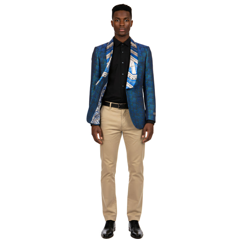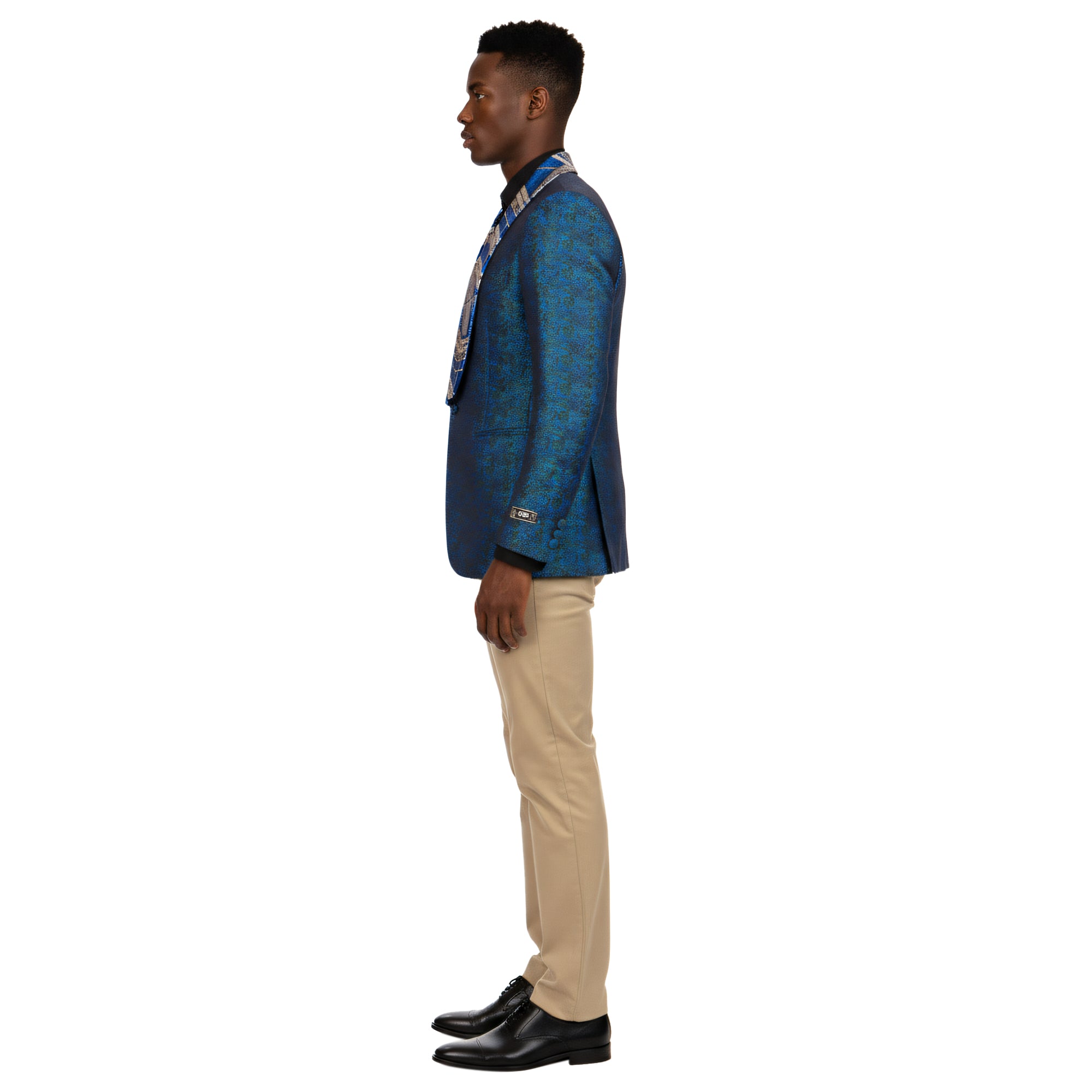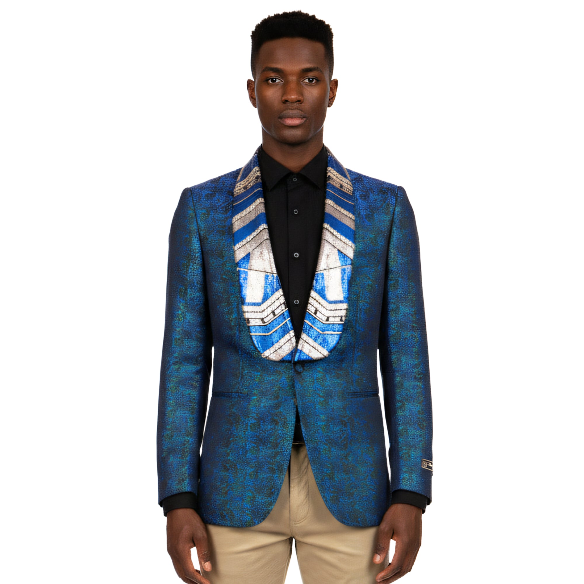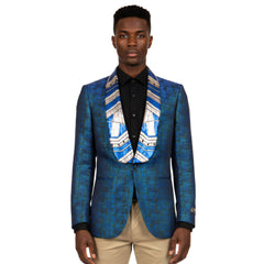 Command attention with the Empire™ Nemes Shawl Lapel Blazer, a luxury statement piece crafted for individuals who embody power, confidence, and distinction. Featuring a richly textured blue and gold body with a bold Egyptian-inspired Nemes shawl lapel, this blazer redefines modern luxury with a touch of royal heritage. Designed in a Hybrid Fit, it blends the structure of a slim cut with the comfort of a modern silhouette—perfect for those who demand both elegance and ease.