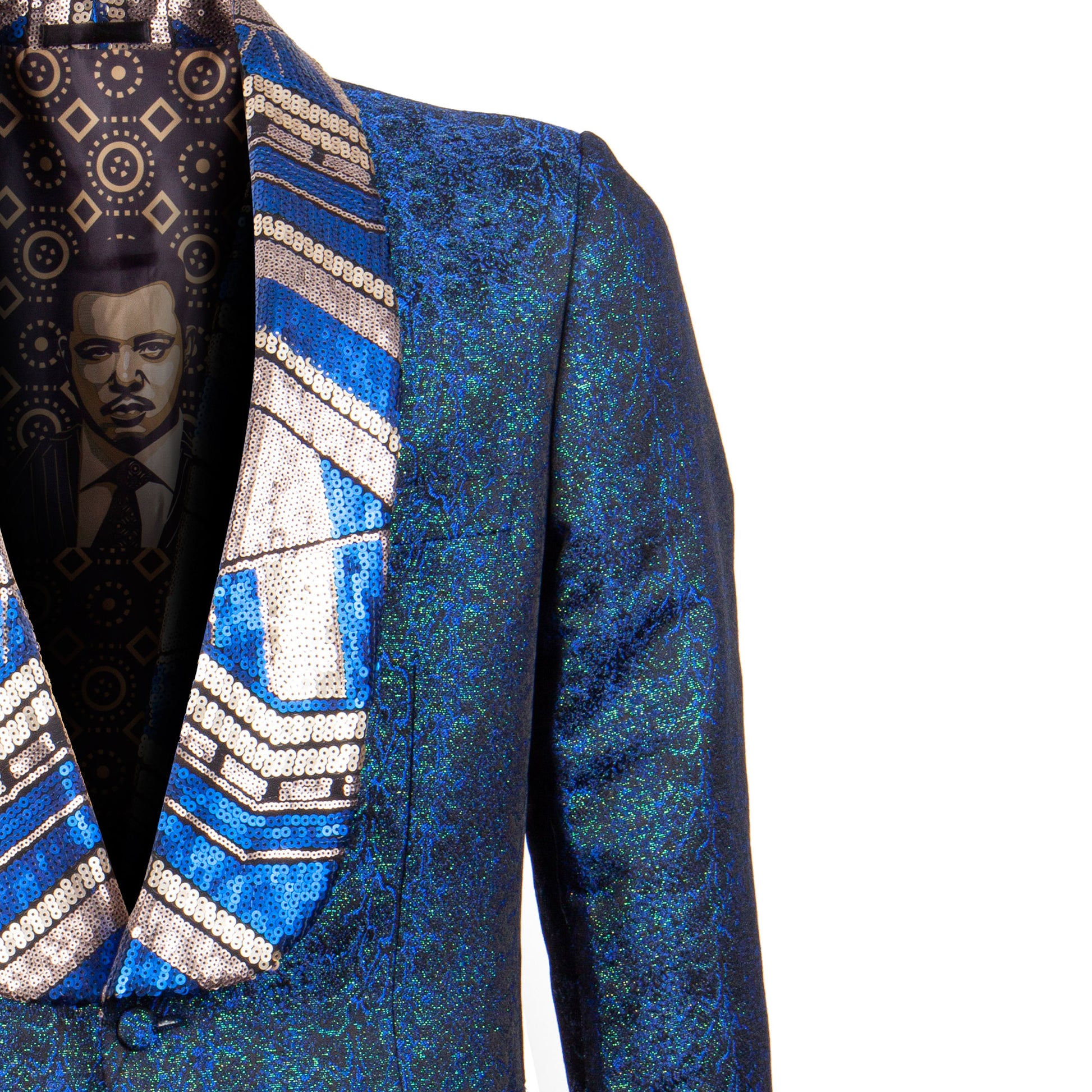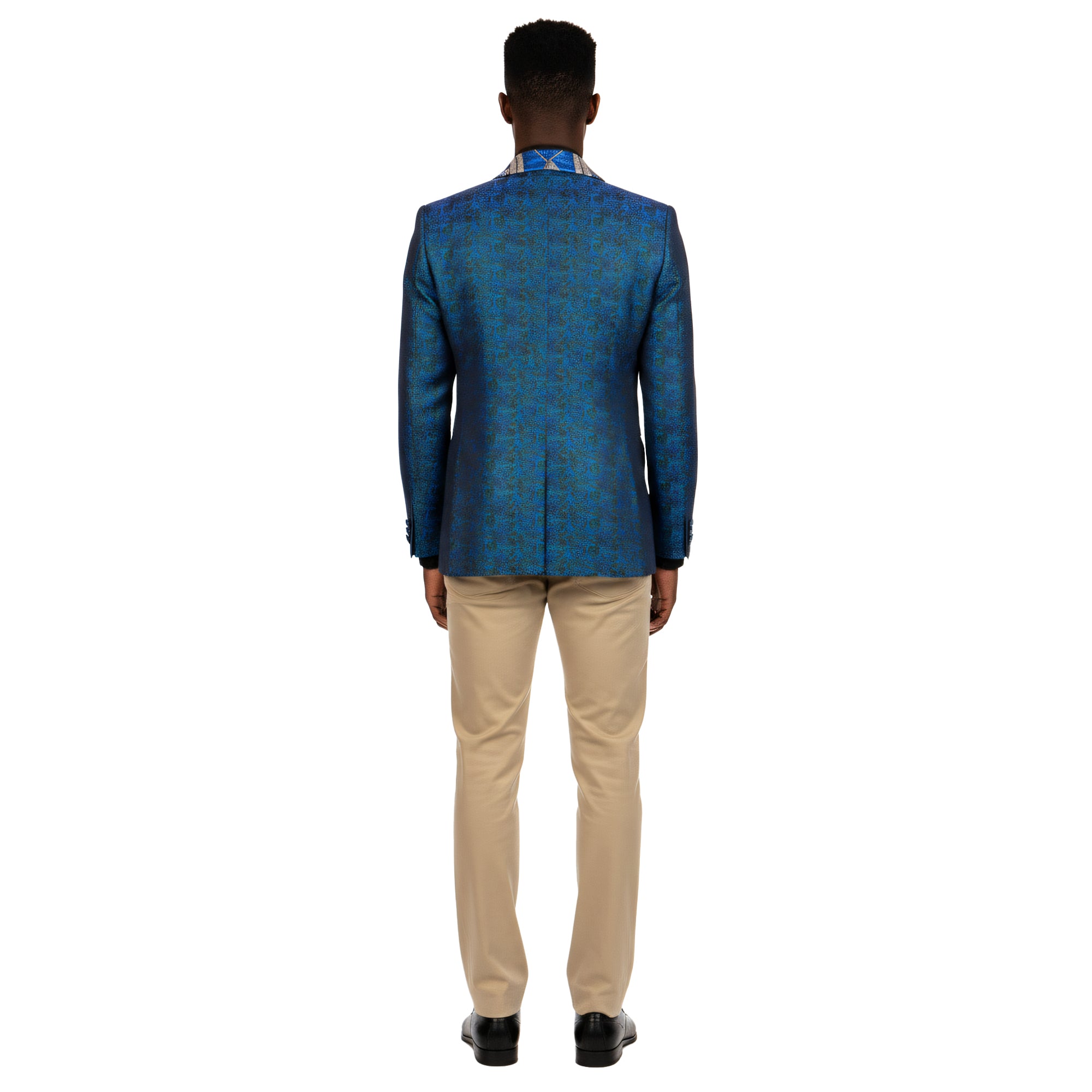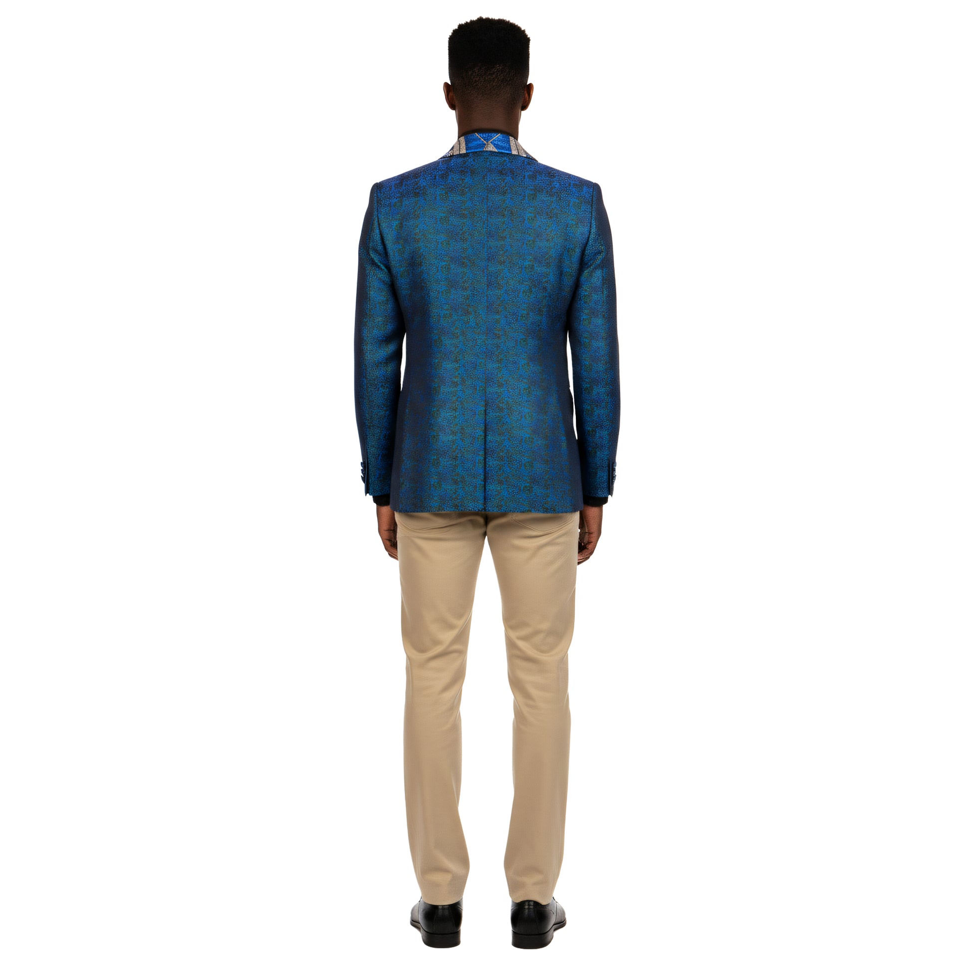 Command attention with the Empire™ Nemes Shawl Lapel Blazer, a luxury statement piece crafted for individuals who embody power, confidence, and distinction. Featuring a richly textured blue and gold body with a bold Egyptian-inspired Nemes shawl lapel, this blazer redefines modern luxury with a touch of royal heritage. Designed in a Hybrid Fit, it blends the structure of a slim cut with the comfort of a modern silhouette—perfect for those who demand both elegance and ease.