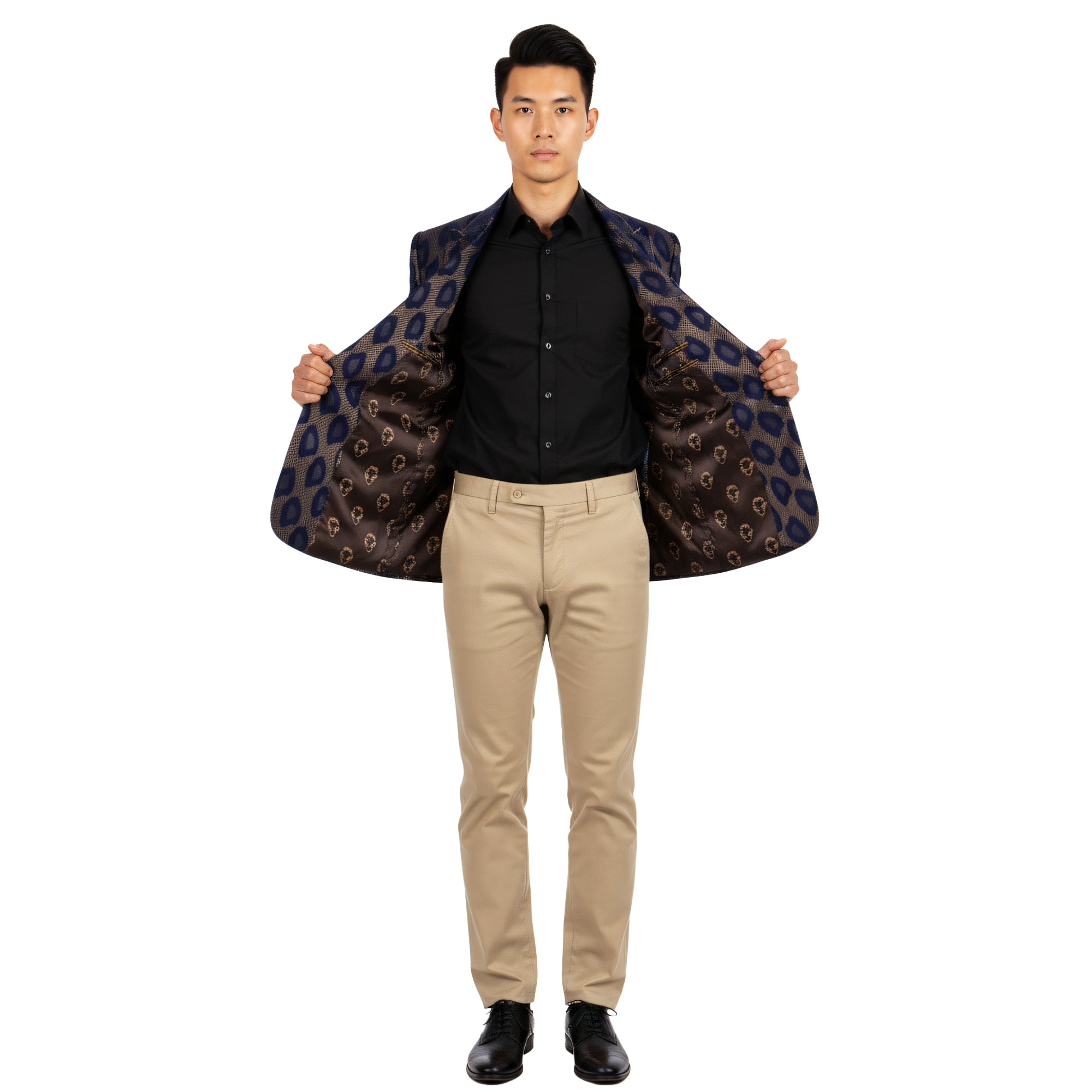 Refined and commanding, the Empire™ Hybrid-Fit Shawl Lapel Blazer is crafted for those who define their own spotlight. Featuring a navy petal-textured fabric with a sleek satin shawl lapel outlined in gold trim, this blazer embodies confidence, sophistication, and modern elegance. Its luxurious texture adds depth and dimension without overpowering, creating the perfect balance between subtlety and statement.