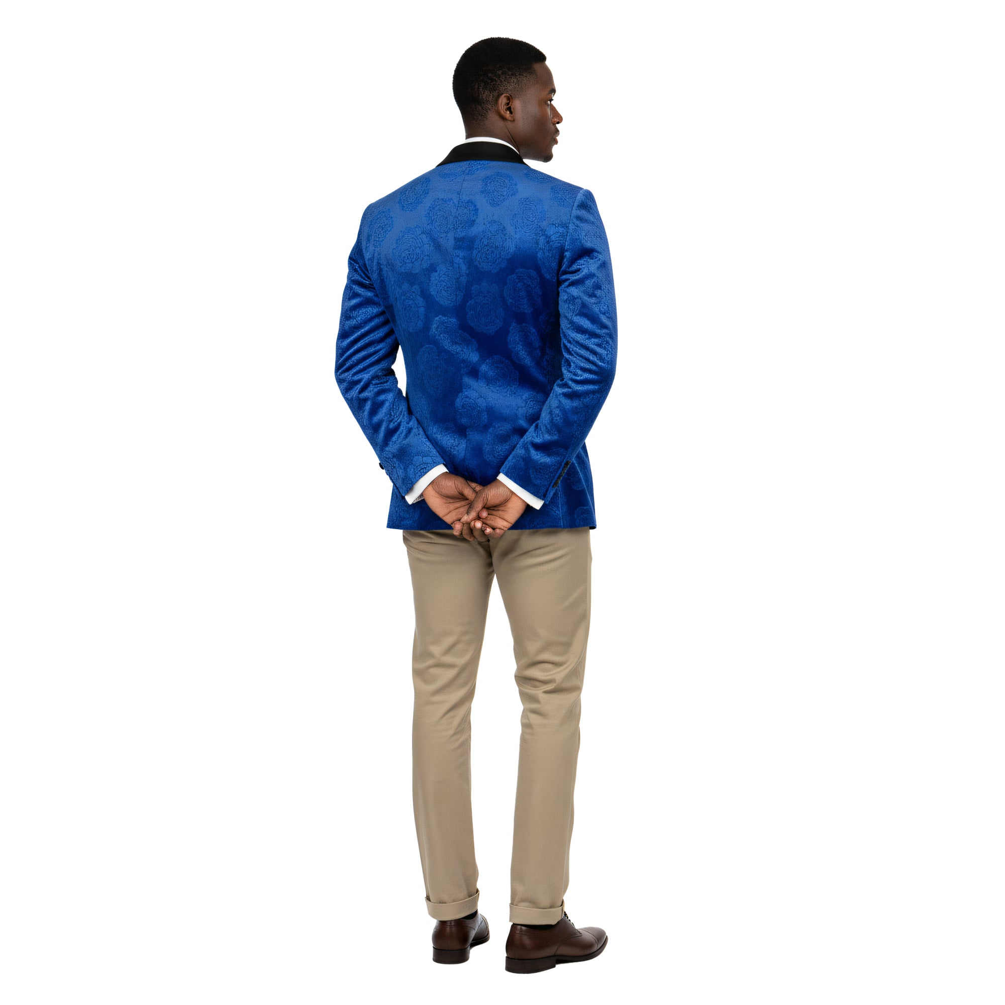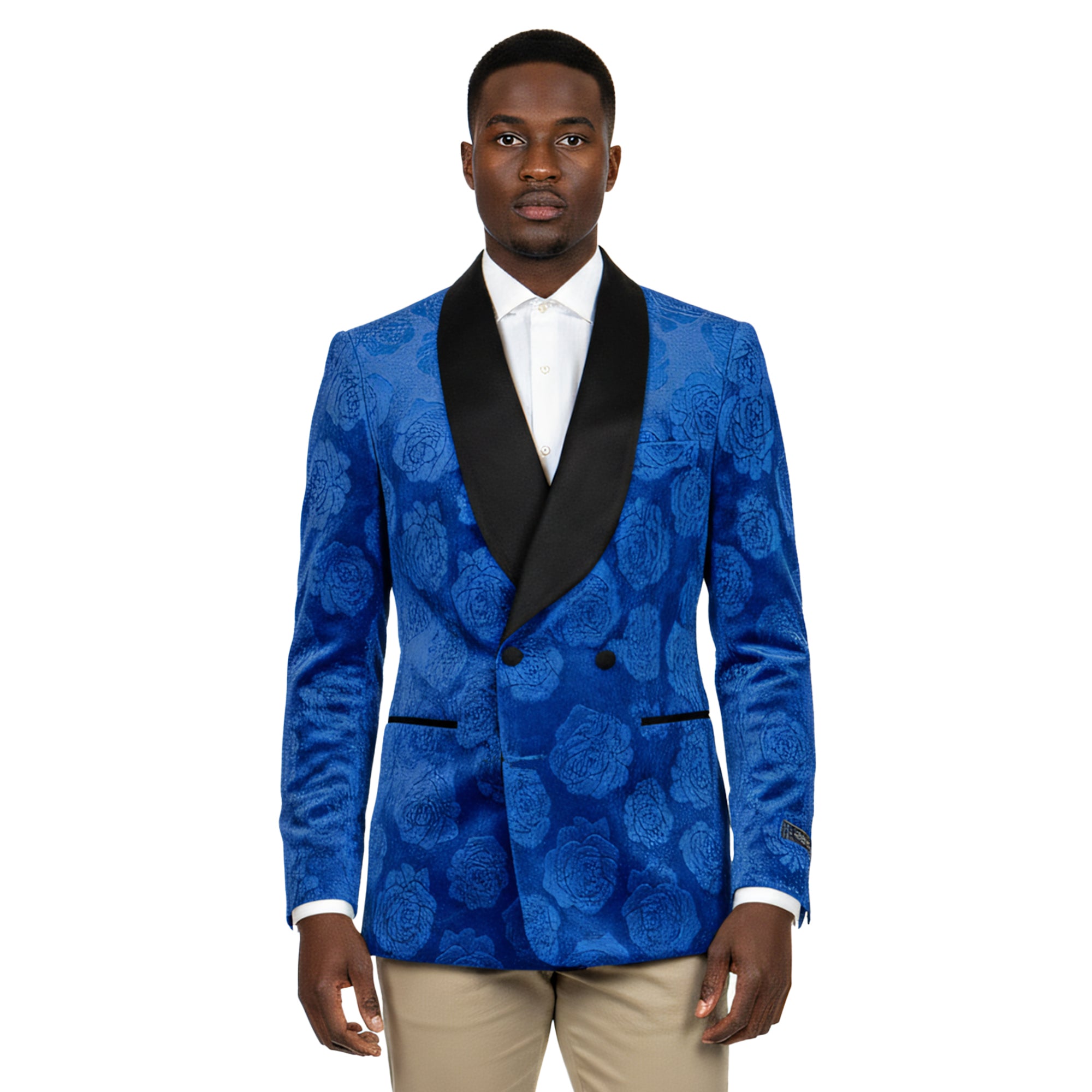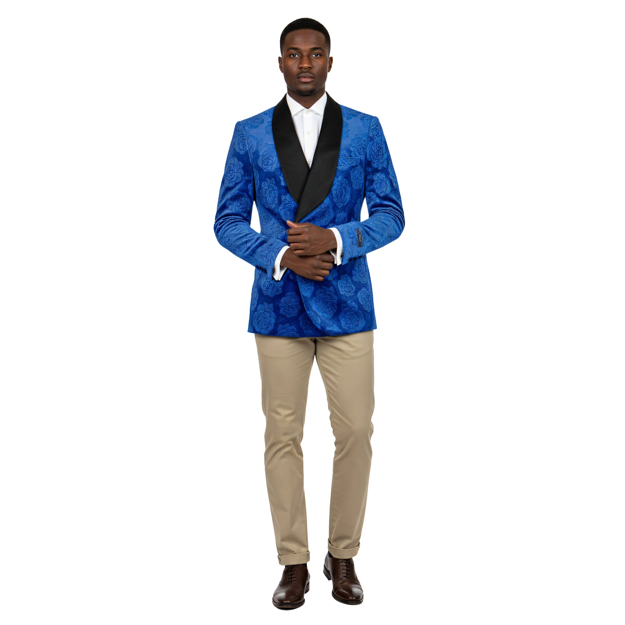 Make an unforgettable entrance with this Empire™ Royal Blue Floral Blazer, a true statement of elegance and confidence. Featuring a luxurious rose-embossed texture and a sleek satin shawl collar, this blazer embodies the perfect fusion of modern artistry and timeless sophistication. Designed in a Hybrid Fit, it delivers a tailored silhouette with just the right amount of flexibility for all-day comfort.