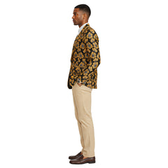 Stand out with confidence in the Empire™ Black & Yellow Hybrid-Fit Blazer, a refined fusion of bold artistry and tailored sophistication. This statement jacket features a vibrant yellow floral embroidered pattern over a deep black textured base, perfectly complemented by a notch lapel with yellow piping and yellow-trimmed flap pockets. Designed in a Hybrid Fit, it delivers a sharp silhouette while maintaining comfort and mobility for any upscale occasion.