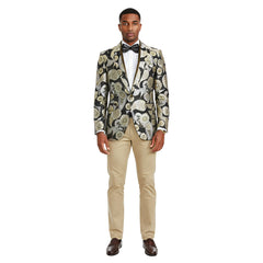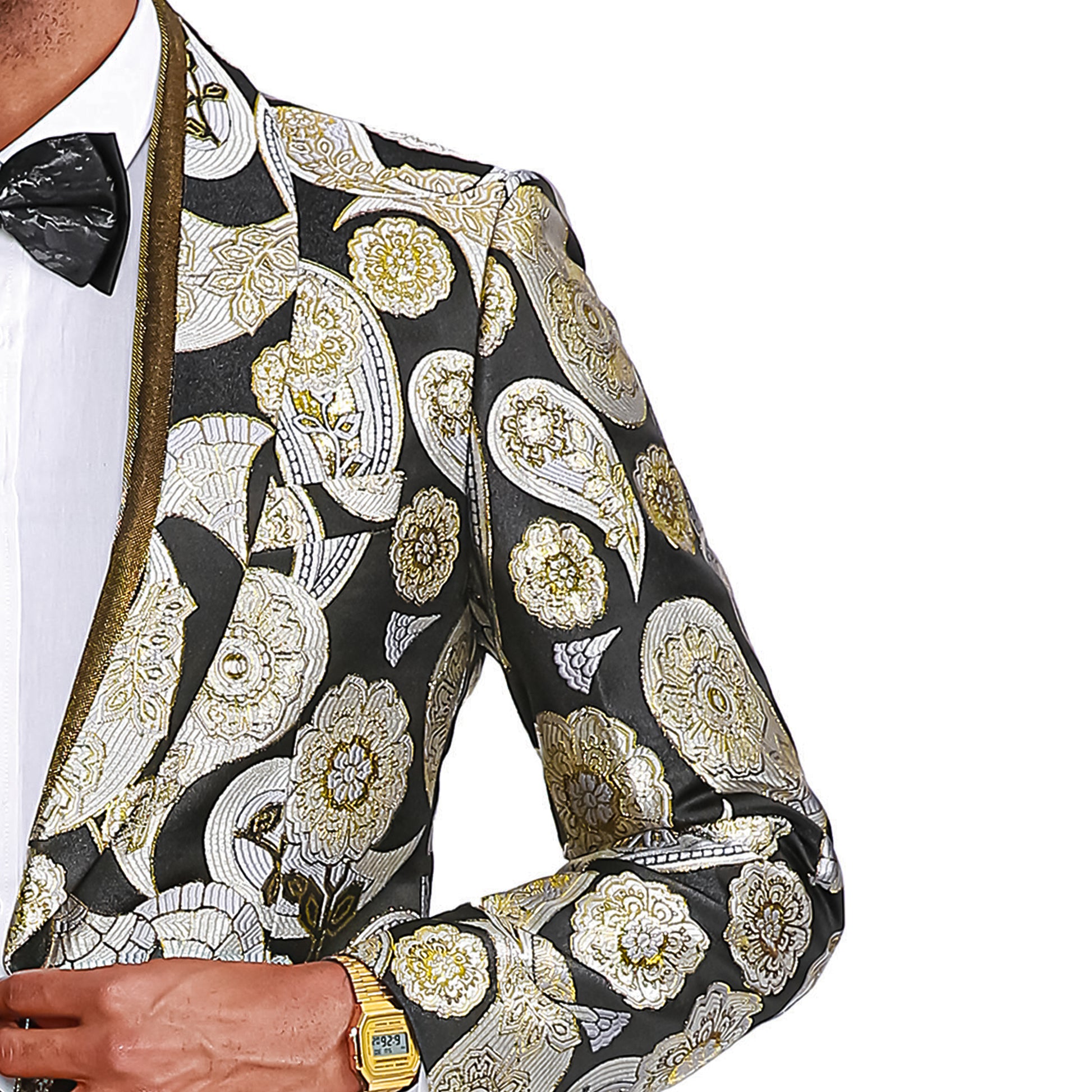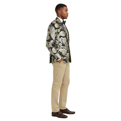 Refined and commanding, the Empire™ Black & Gold Hybrid-Fit Blazer defines luxury with a modern edge. Featuring an intricate metallic floral and paisley brocade pattern woven across a rich black base, this jacket radiates sophistication and style. The satin shawl lapel trimmed in gold adds a distinguished touch, creating a sleek contrast that captures light with every movement.