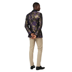 Make a powerful entrance with this Empire™ (TV Series) floral brocade blazer in Purple & Gold, crafted for those who embody confidence, charisma, and elevated style. Officially branded and inspired by the hit FOX series Empire, this luxury blazer fuses bold artistry with refined tailoring. The Hybrid Fit provides a perfect balance between a slim and modern silhouette, ensuring both structure and comfort. Featuring a radiant gold brocade base with rich purple floral detailing and a wide satin shawl lapel, this design radiates opulence, sophistication, and star-level presence.