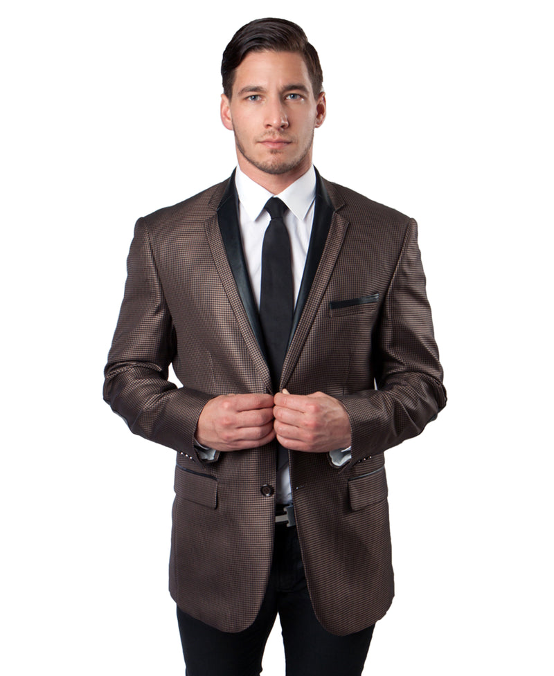 Elevate your evening wear with this striking Brown and Dark Tan Sport Coat. Designed for the man who wants to stand out, this jacket combines a classic pattern with a modern, high-sheen finish for an unforgettable statement piece.