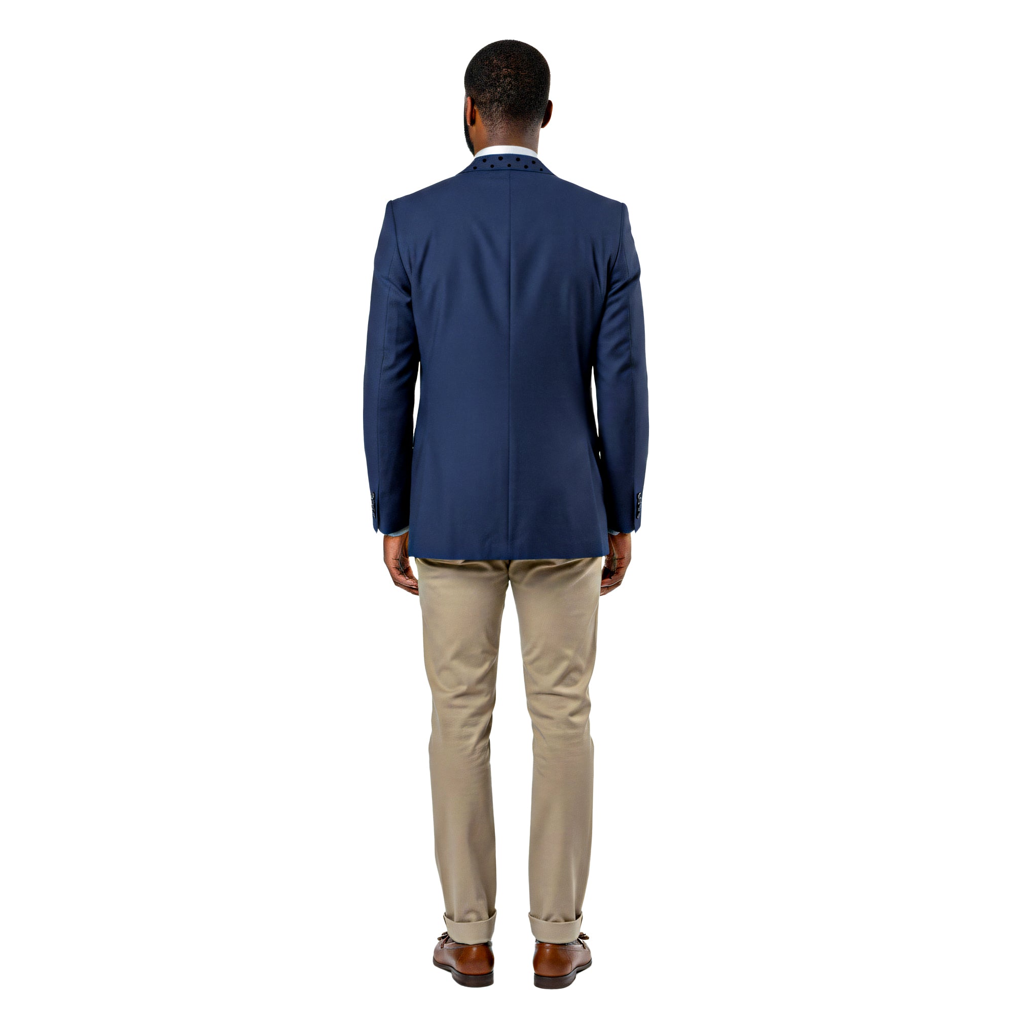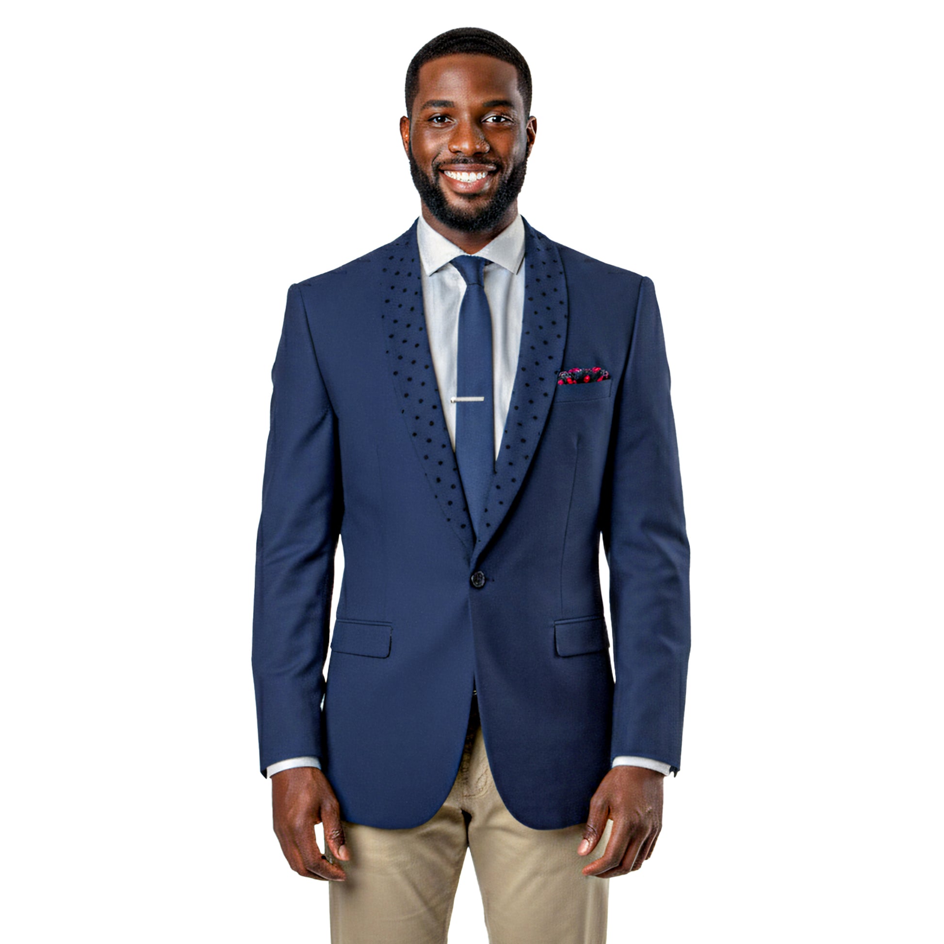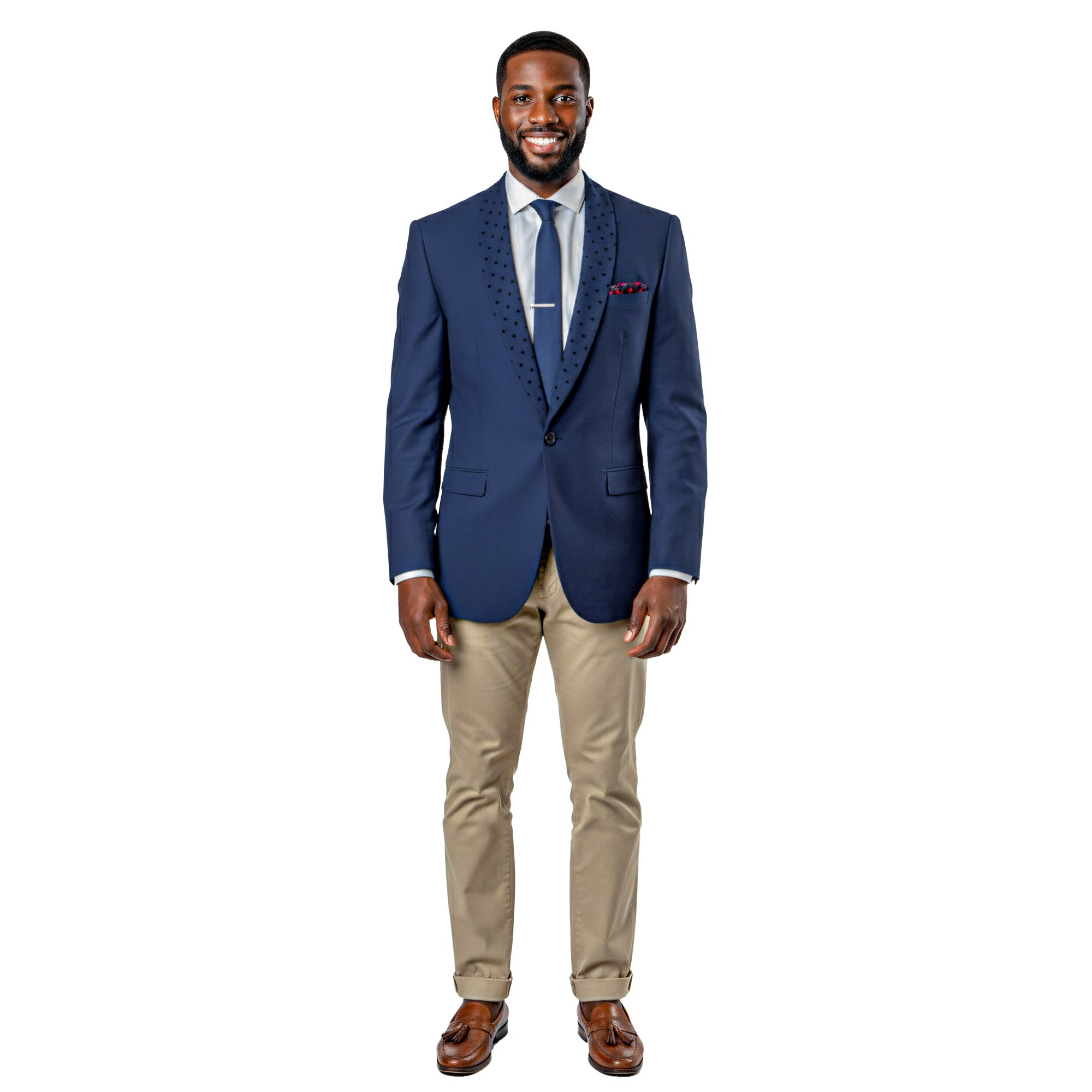 Elevate your style with the Tazzio Solid Navy Slim Fit Jacket, a fusion of classic charm and modern elegance. Designed by the renowned Tazzio brand, this jacket features a one-button front closure, a slim fit silhouette, and a shawl collar adorned with subtle black polka dots. Its thoughtful details include side vents, interior French facing, multiple pockets, underarm sweat guards, and impeccable craftsmanship. Whether you're dressing up for a formal event or adding a touch of sophistication to a casual ensemble, the Tazzio Solid Navy Slim Fit Jacket is the epitome of versatile and timeless fashion, ensuring you make a lasting impression with every wear.