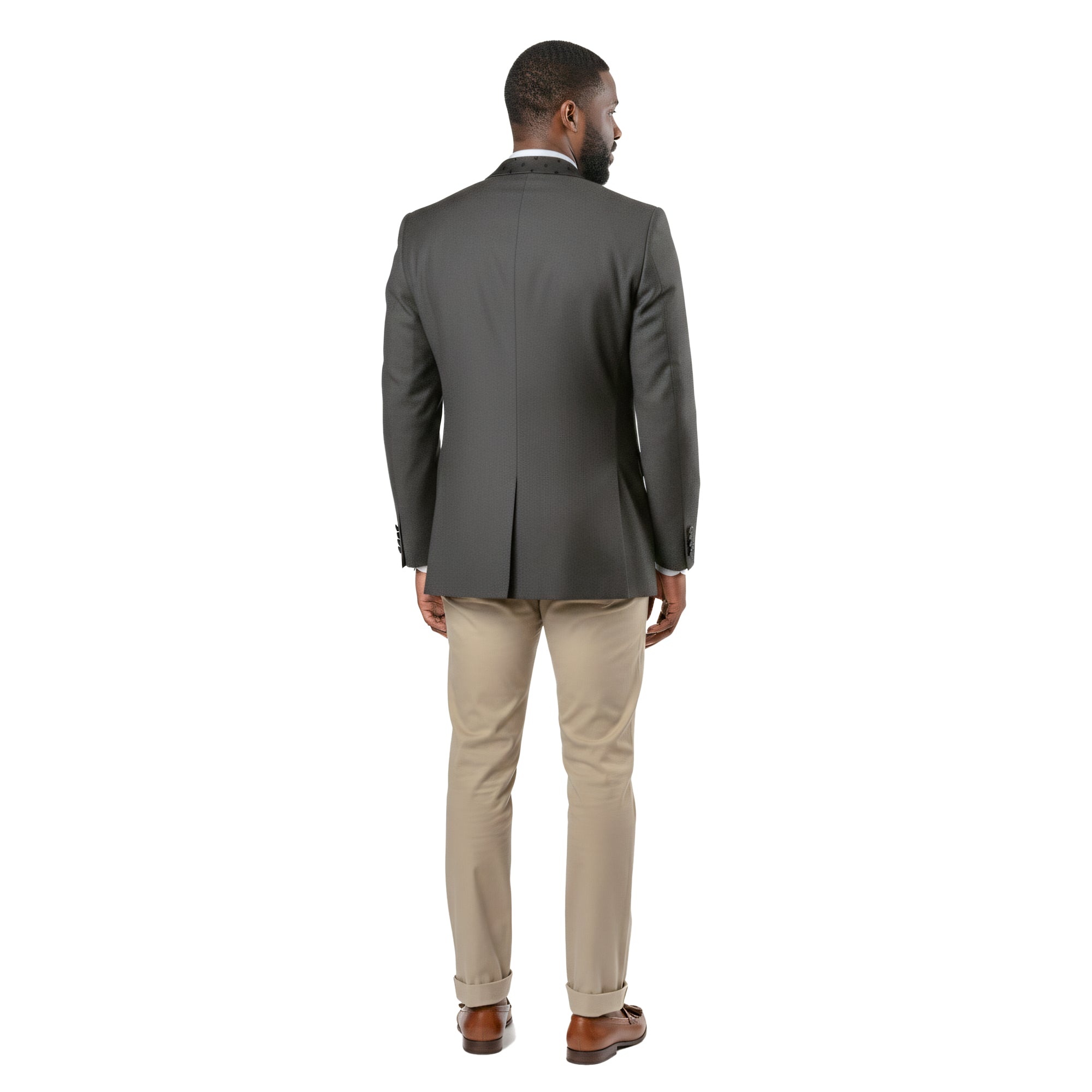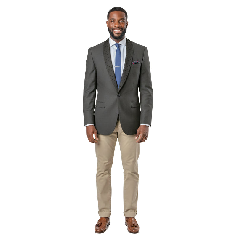 Elevate your style with the Tazio Solid Grey Slim Fit Jacket, a fusion of classic charm and modern elegance. Designed by the renowned Tazio brand, this jacket features a one-button front closure, a slim fit silhouette, and a shawl collar adorned with subtle black polka dots. Its thoughtful details include side vents, interior French facing, multiple pockets, underarm sweat guards, and impeccable craftsmanship. Whether you're dressing up for a formal event or adding a touch of sophistication to a casual ensemble, the Tazio Solid Gray Slim Fit Jacket is the epitome of versatile and timeless fashion, ensuring you make a lasting impression with every wear.