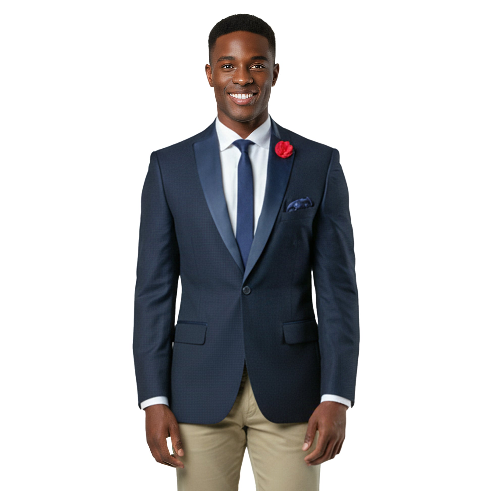 This Slim Fit jacket showcases a classic birdseye weave paired with a smooth satin shawl lapel for a refined and modern formal look. The subtle two dot texture of the birdseye pattern adds depth and sophistication while keeping the jacket versatile enough for special events, evenings out, or elevated dress wear. With its tailored silhouette, this piece offers a clean and polished finish that complements any formal ensemble.
