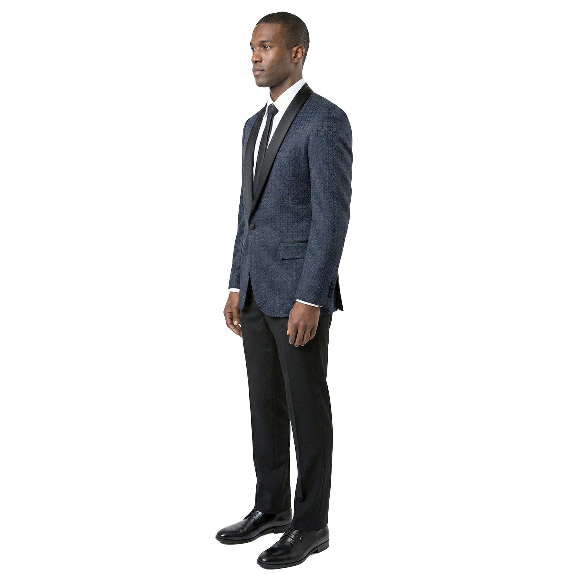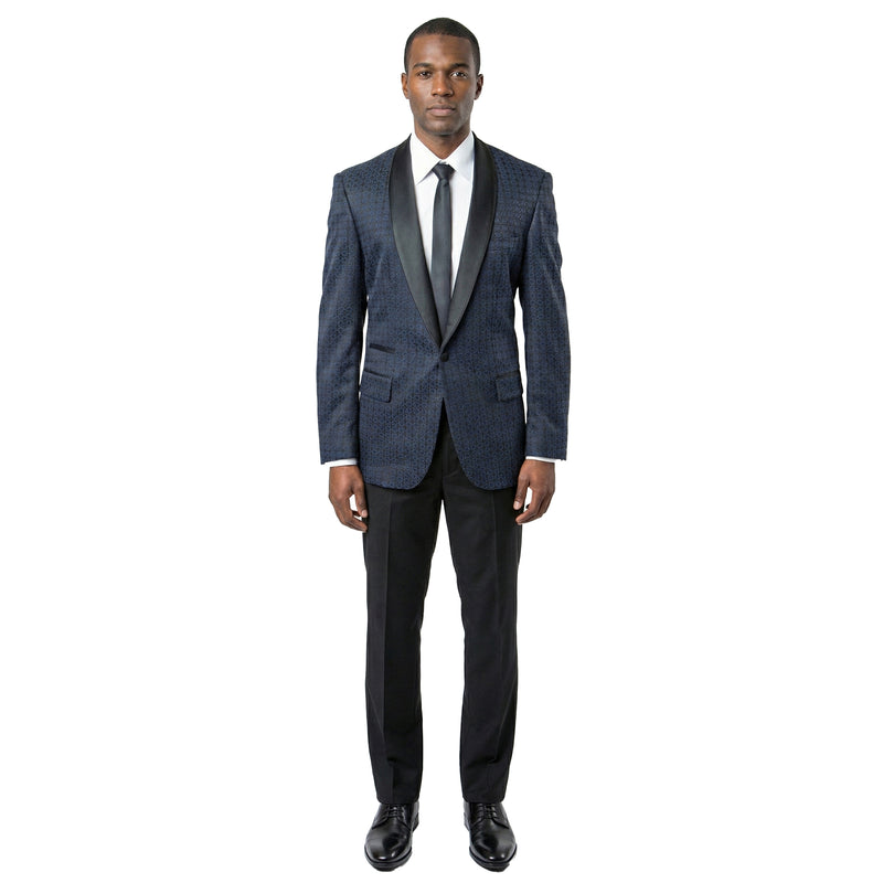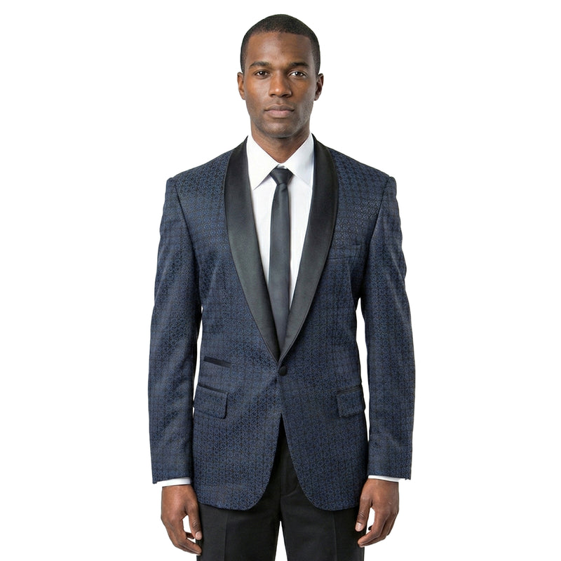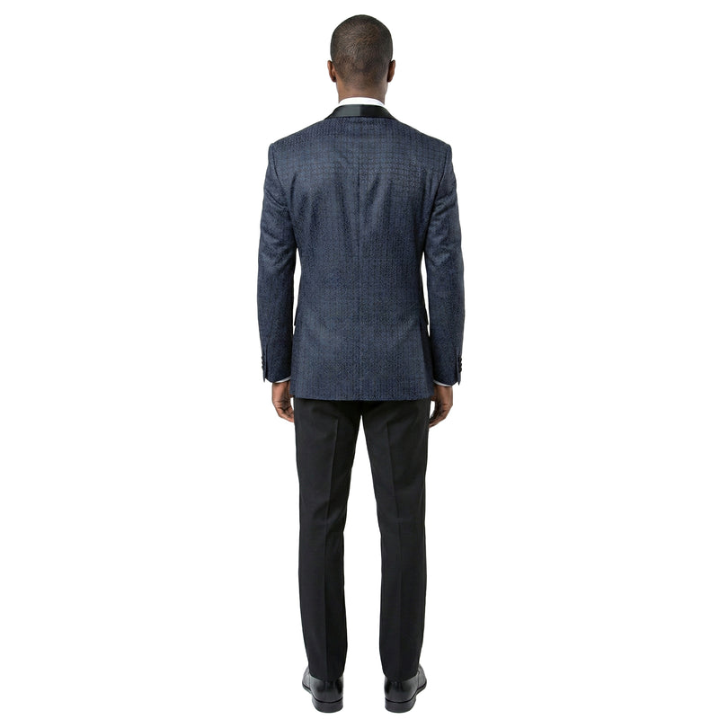 This Slim Fit jacket features a refined geometric medallion jacquard pattern paired with a sleek satin shawl lapel, creating a sophisticated and eye catching formal look. The intricate medallion weave adds depth and richness while maintaining a polished profile that works perfectly for special events, performances, and elevated evening wear. Designed with a tailored silhouette, this jacket offers a clean, modern finish that pairs effortlessly with dress shirts and formal accessories.
