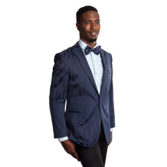 The jacket is crafted from a deep navy or midnight blue fabric with contrasting vertical sheen stripes woven into the material. This textural variation gives the jacket a sophisticated, fluid appearance that changes beautifully as it catches the light. Details like the slim peak lapel and streamlined pockets complete the modern, tailored look.