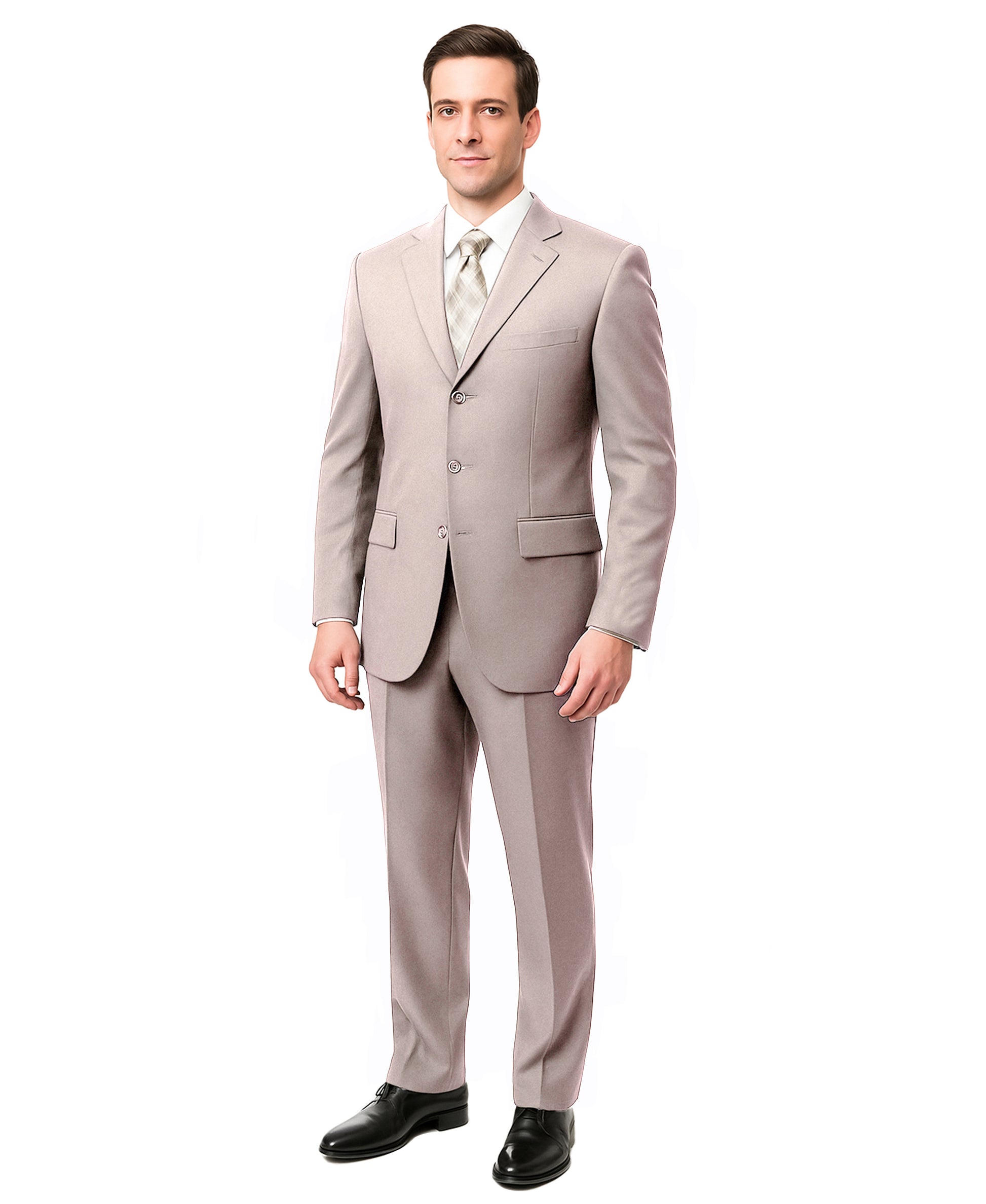 The suit features a light, solid beige that is both versatile and memorable, standing out in a sea of dark colors. The two-piece set is crafted with a classic, comfortable cut that maintains a sharp, professional silhouette. This suit is perfect for the office, business travel, and fall/winter formal events.
