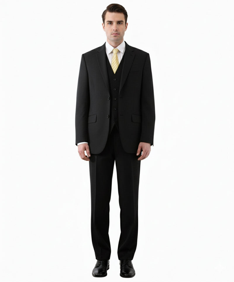 Crafted in a deep, rich black, the suit features subtle tone-on-tone pinstripes that visually elongate and slim the silhouette. The inclusion of the matching vest not only adds a layer of formal elegance but keeps your look sharp and put-together even when the jacket is removed. The modern fit provides a clean, comfortable, and contemporary profile.
