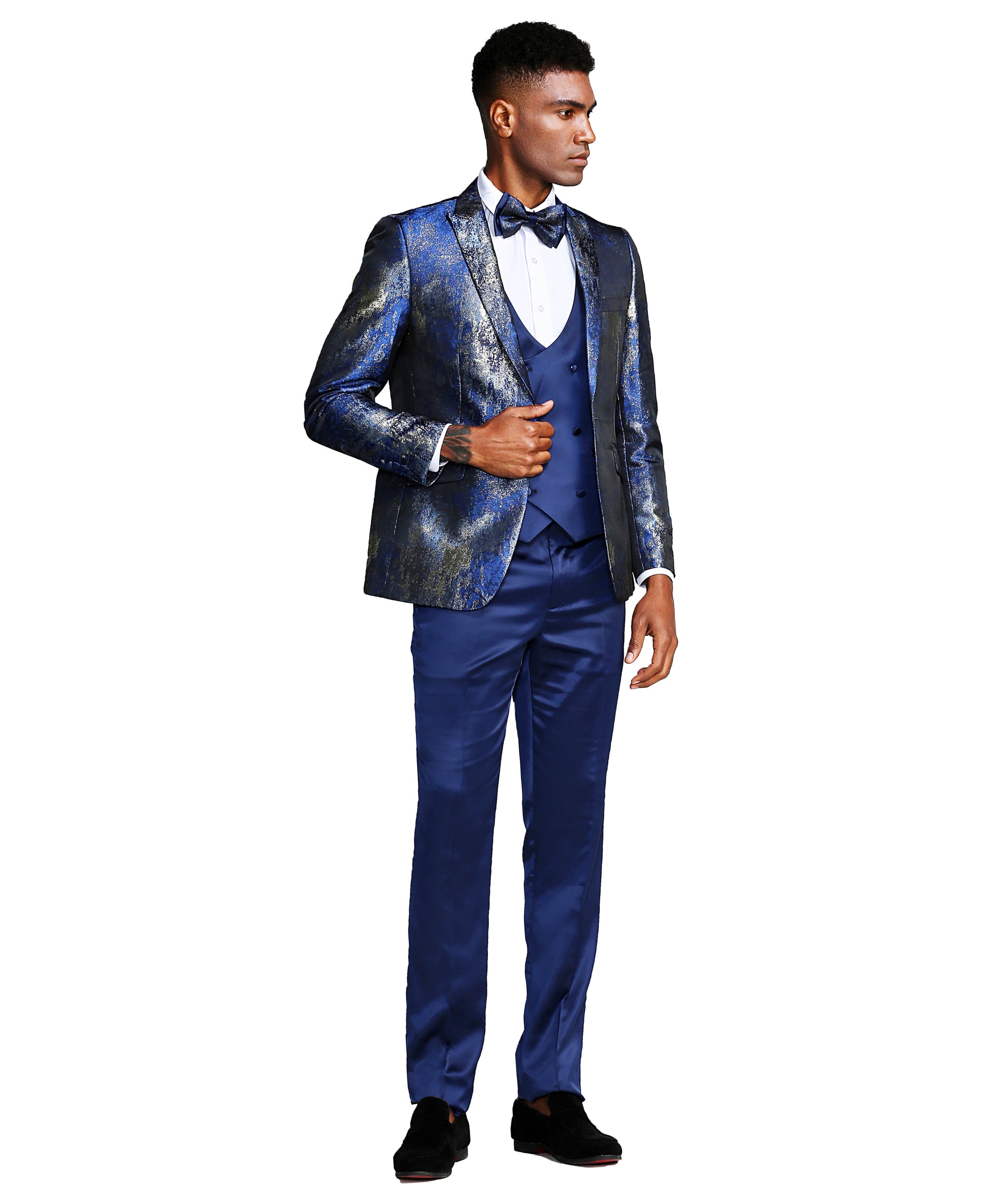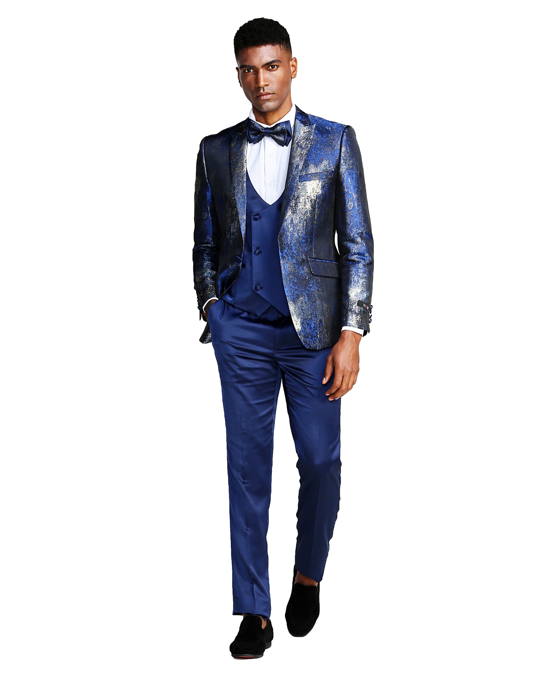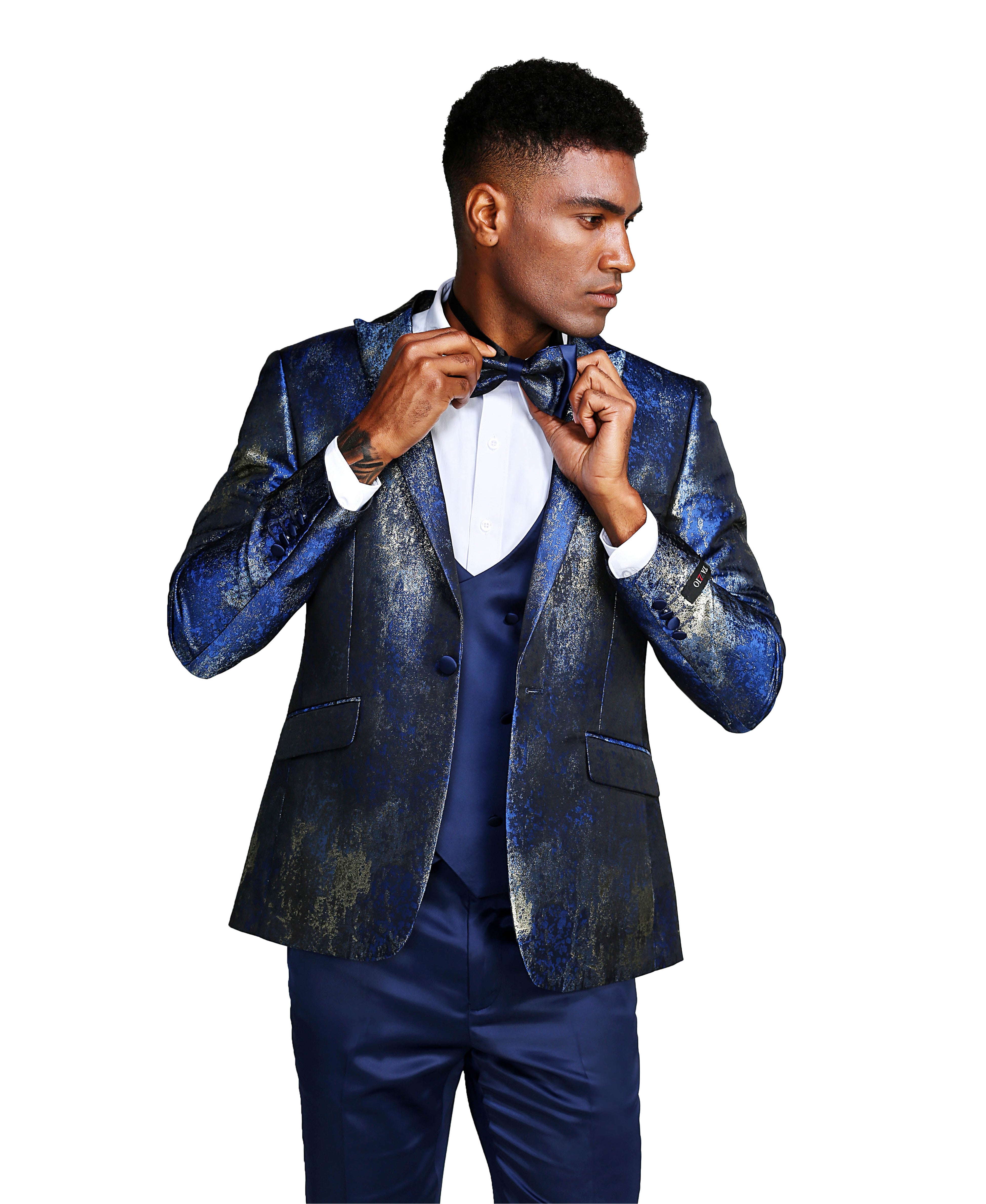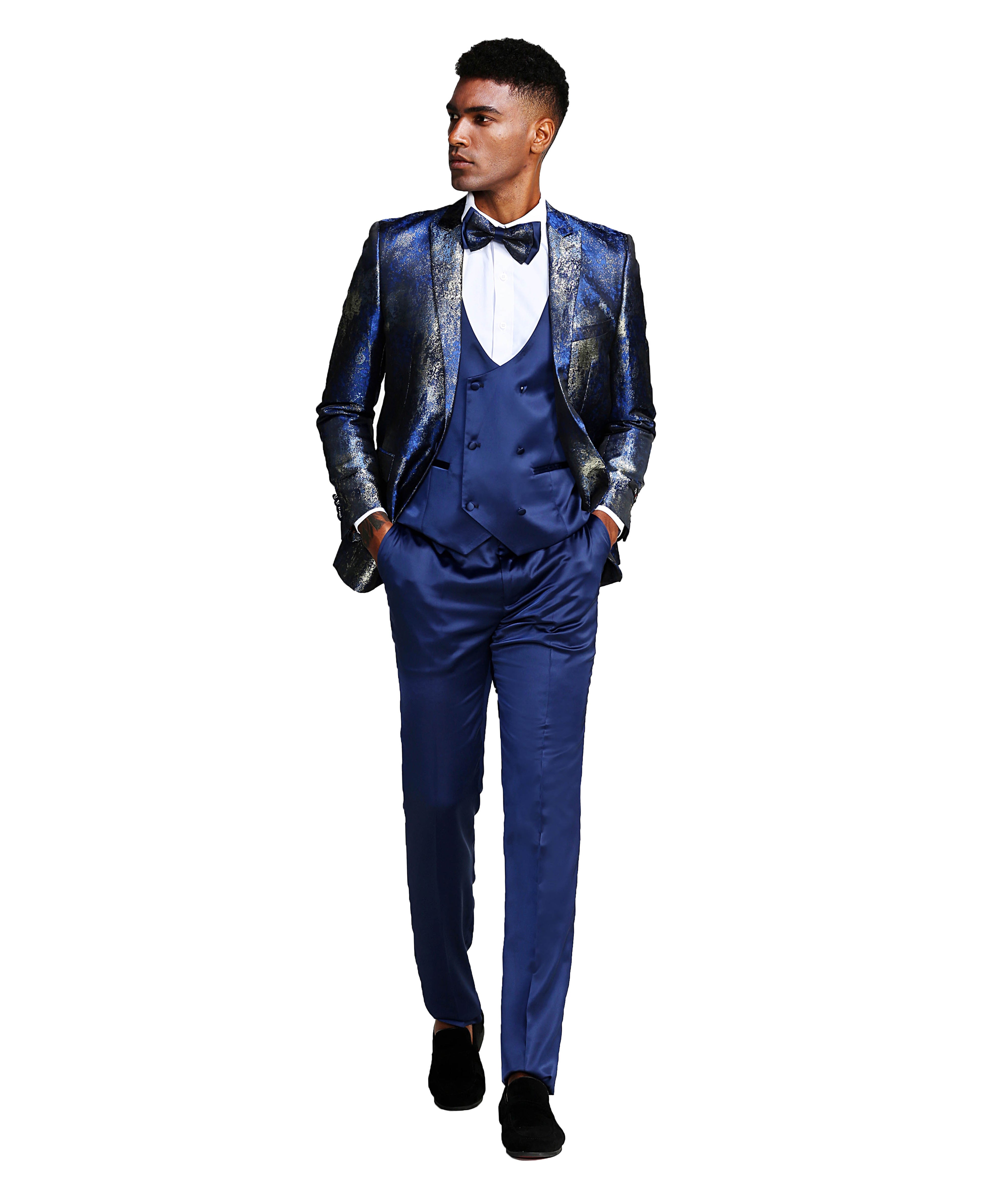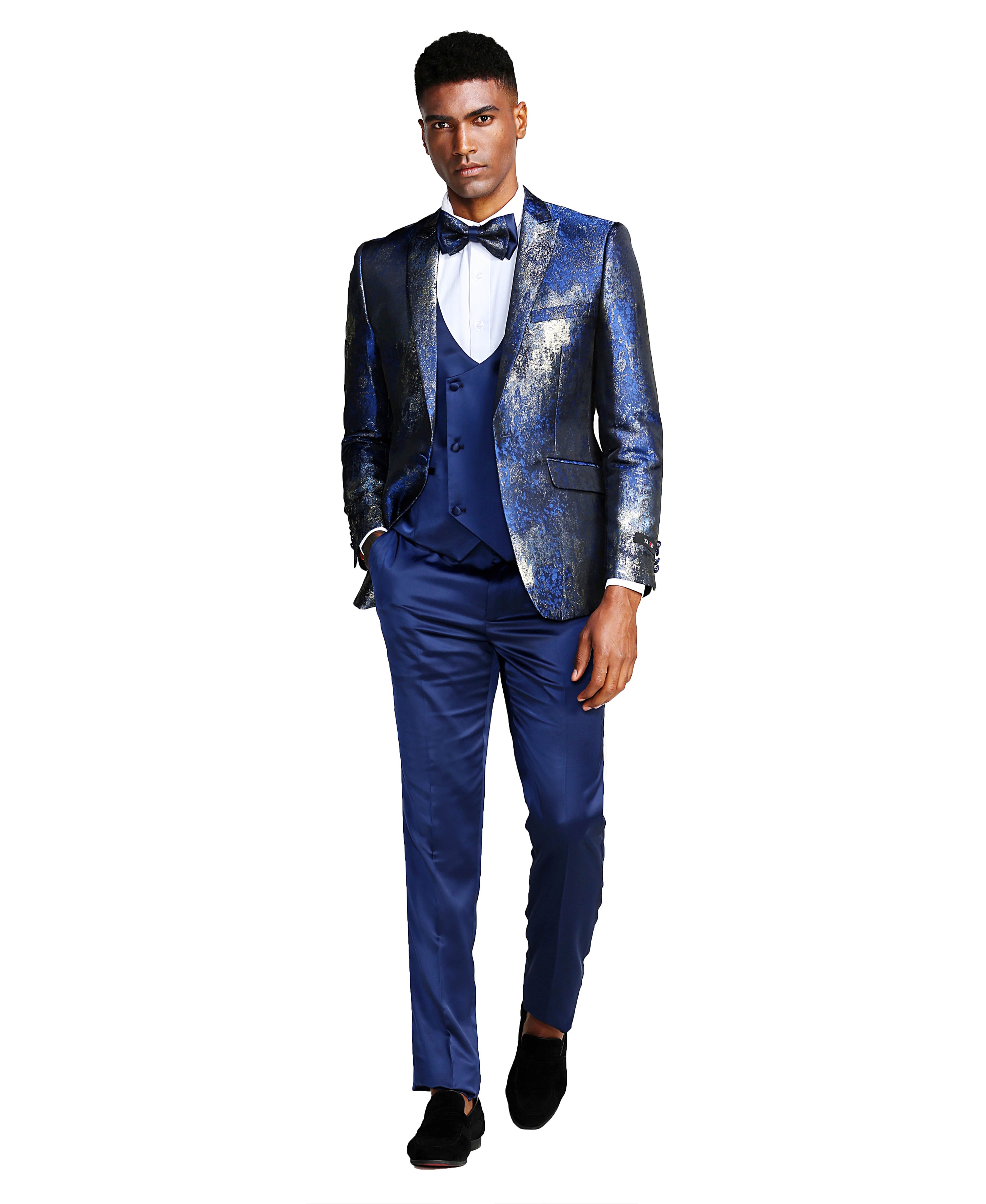 ¿Busca un traje que seguramente llamará la atención? ¡No busques más que nuestro traje azul y plateado brillante con solapa de pico de 3 piezas! Este traje irradia confianza y sofisticación con su combinación única y llamativa de colores plateado y azul y su elegante diseño de solapa en pico. Los pantalones ajustados completan el look, creando una silueta estilizada que es a la vez cómoda y elegante. Perfecto para cualquier ocasión formal, este traje seguramente llamará la atención y dejará una impresión duradera. ¡Eleva tu guardarropa y haz una declaración audaz con nuestro traje imprescindible de 3 piezas!