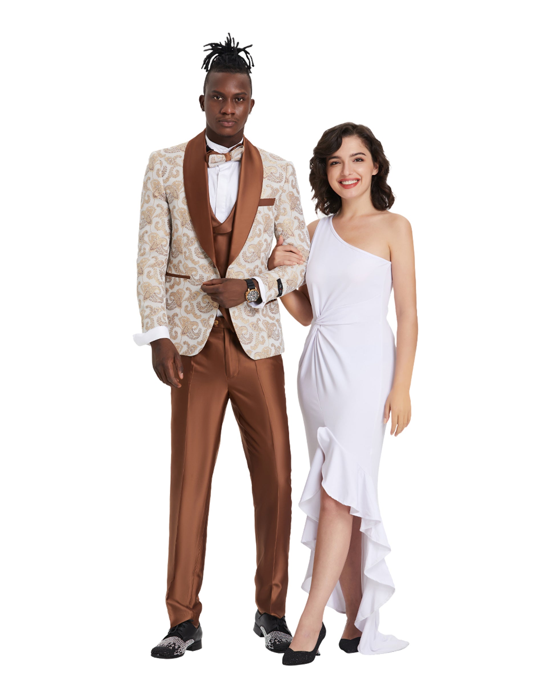 Este traje premium para hombre presenta una sofisticada chaqueta con estampado de cachemira, cuello chal, cierre de un botón, dos bolsillos con aberturas de satén y un bolsillo en el pecho con ribete de satén. El chaleco cruzado ofrece un cierre de tres botones y un color sólido para una apariencia clásica. Los pantalones de satén ajustados completan el look con una pajarita a juego. Perfecto para una ocasión formal.