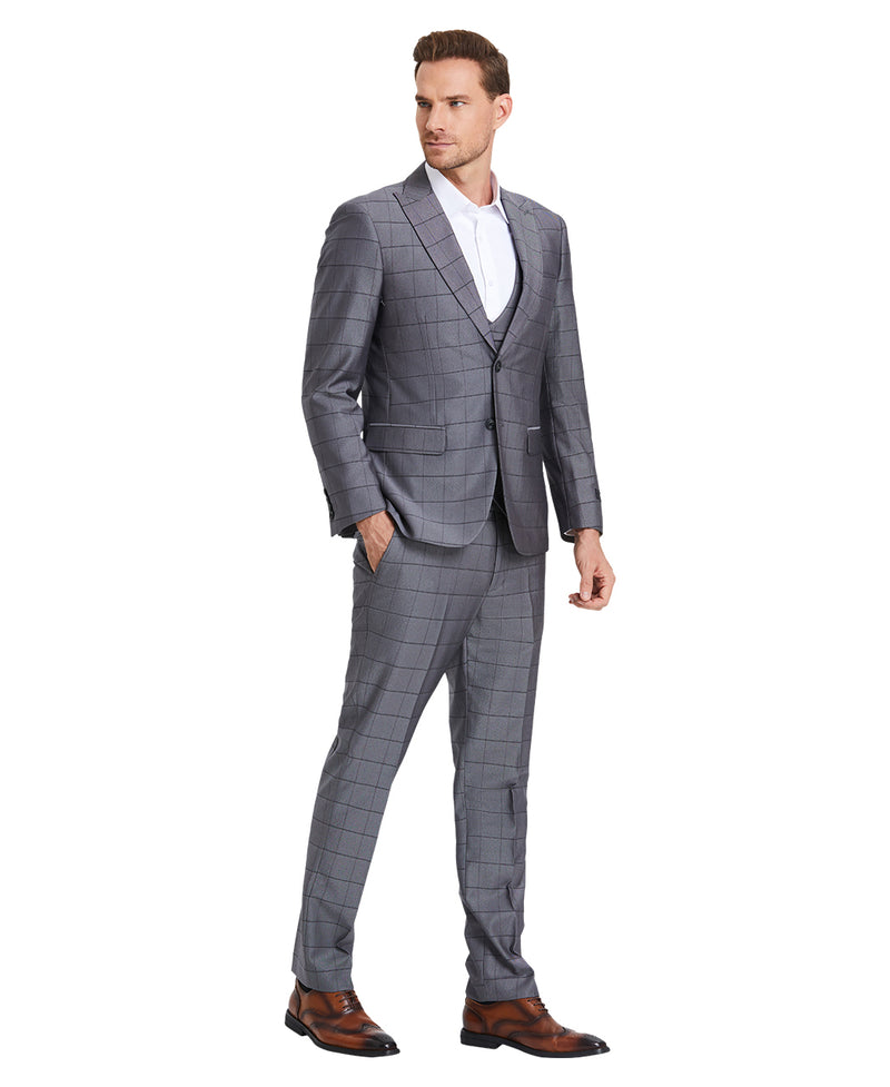 Mejora tu guardarropa con el traje a cuadros gris con ventana Tazio Gunmetal, un clásico atemporal diseñado con sofisticación y estilo. Con una chaqueta Windowpane con solapas de pico, cierre de dos botones y bolsillos laterales con solapa, además de un sofisticado chaleco cruzado de estilo windowpane y un pantalón ajustado para una silueta súper delgada. Luzca elegante, siéntase seguro y haga una declaración con este diseño atemporal de ventana a cuadros.