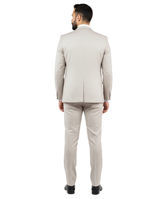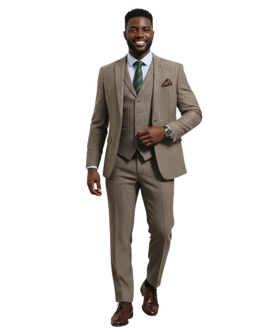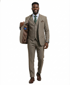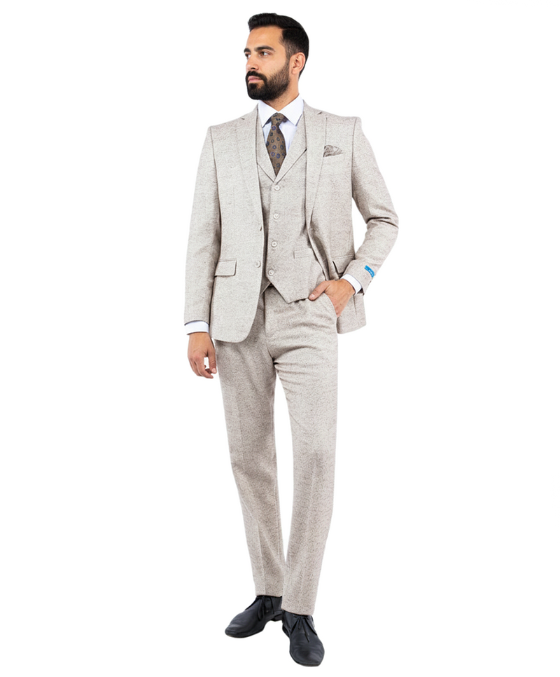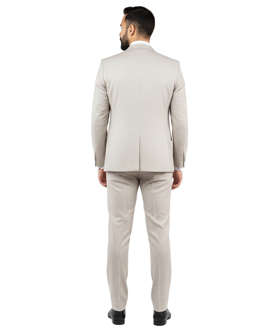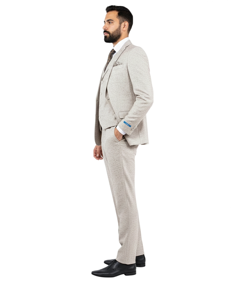 Elevate your formal wardrobe with this sophisticated 3-piece slim-fit suit, designed for the modern gentleman who values both style and substance. Featuring a unique, high-quality textured fabric reminiscent of classic tweed, this ensemble offers a refreshing alternative to standard flat-color suits. The soft, light beige/sand palette makes it an ideal choice for outdoor weddings, spring galas, or professional business settings. Precisely tailored to provide a sharp, streamlined silhouette, this set includes a structured blazer, a matching five-button waistcoat, and tapered trousers, ensuring you look impeccably polished from every angle.