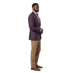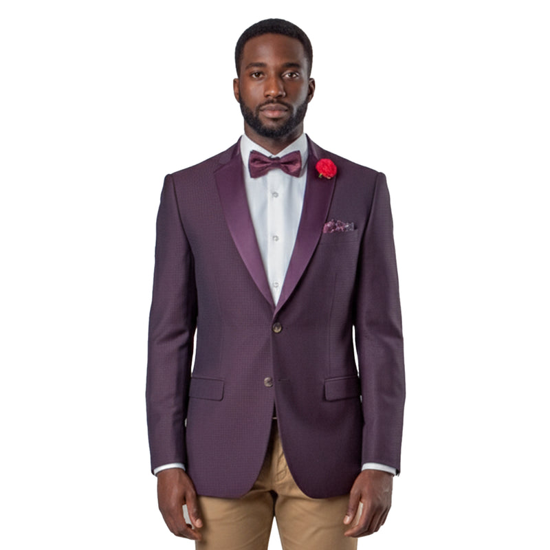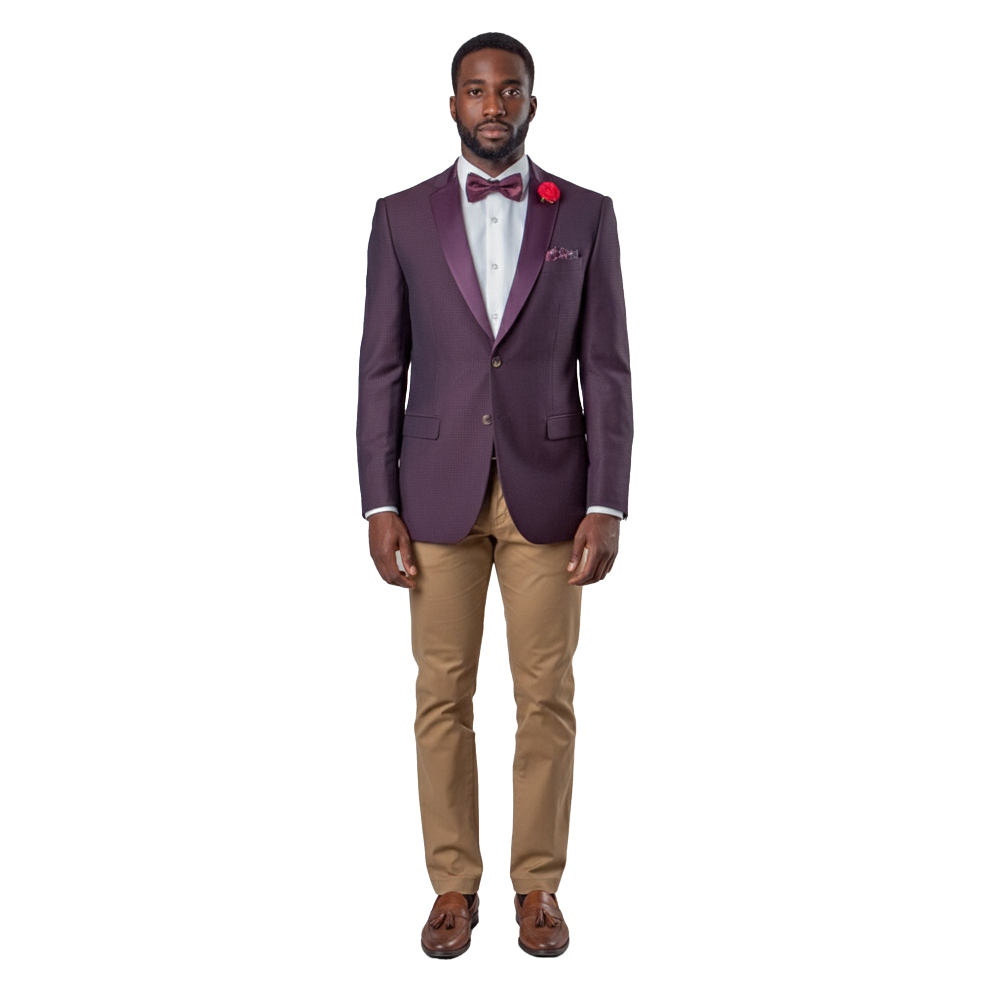 This Slim Fit jacket showcases a classic birdseye weave paired with a smooth satin shawl lapel for a refined and modern formal look. The subtle two dot texture of the birdseye pattern adds depth and sophistication while keeping the jacket versatile enough for special events, evenings out, or elevated dress wear. With its tailored silhouette, this piece offers a clean and polished finish that complements any formal ensemble.