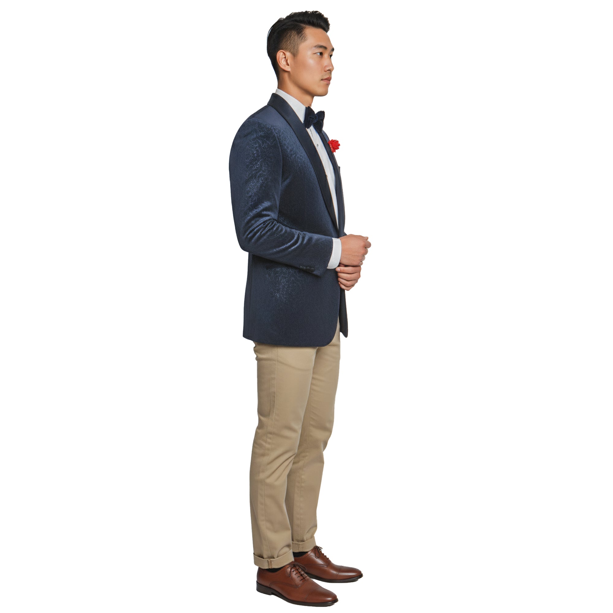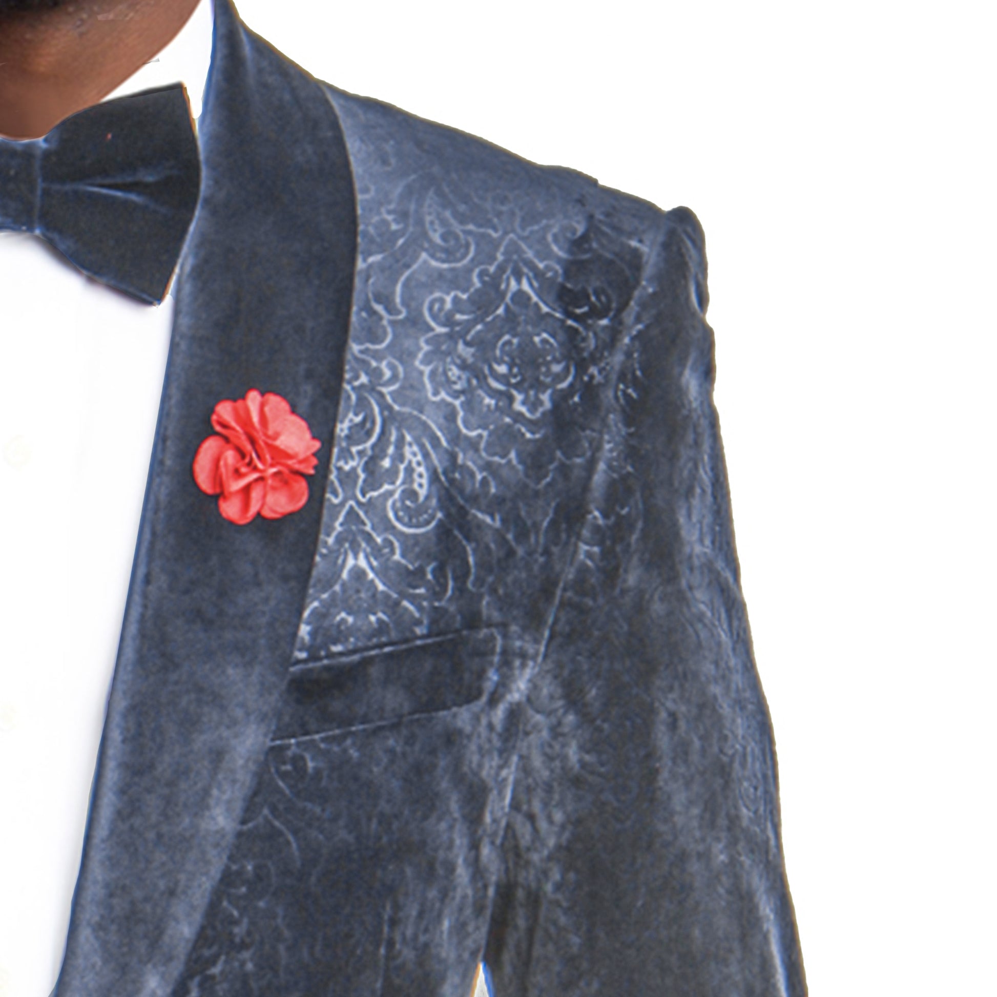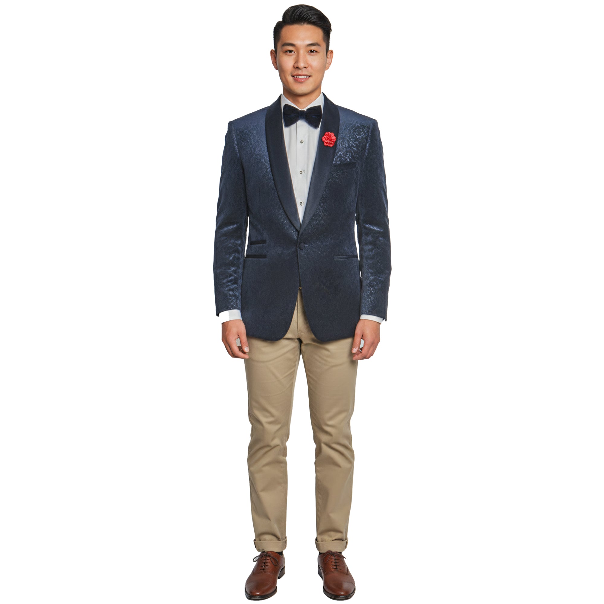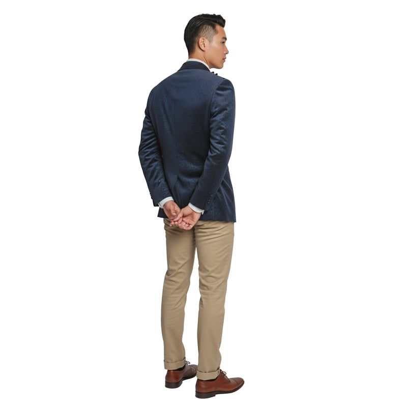 Elevate your wardrobe with this luxurious Empire™ Velvet Blazer, crafted in a deep navy tone with an embossed paisley texture for a rich, dimensional look. Designed with a smooth shawl collar and modern fit silhouette, this sportcoat delivers refined elegance perfect for galas, red carpet events, weddings, or elevated night-out style. The single-button closure and premium interior finishes highlight the craftsmanship Empire™ is known for—making this jacket a standout piece for the fashion-forward gentleman.