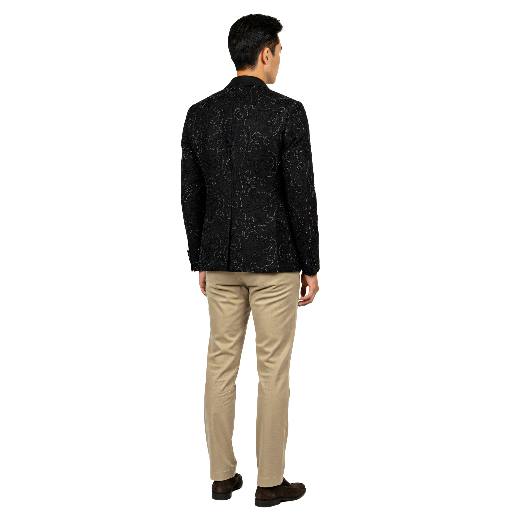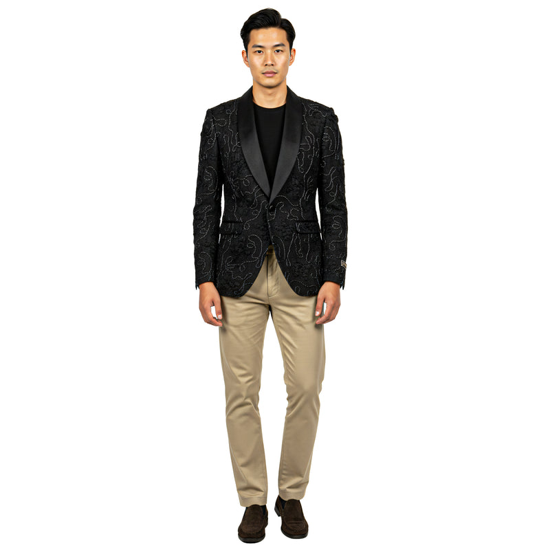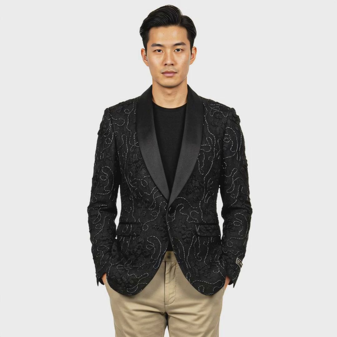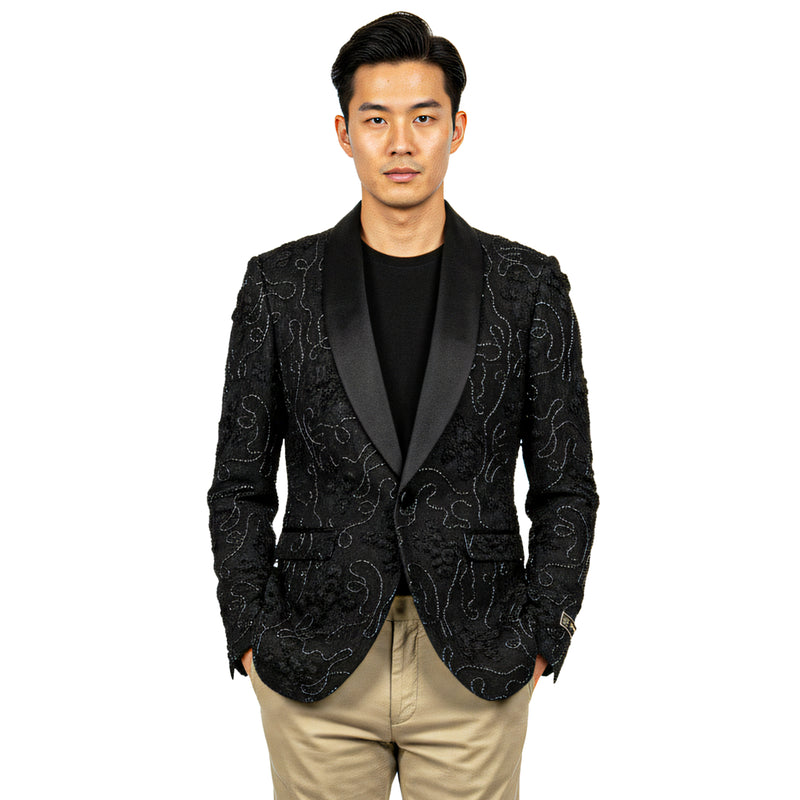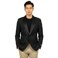 This sophisticated dinner jacket exudes timeless luxury with its richly textured floral embroidery and intricate beadwork set against a deep black base. The satin shawl lapel provides a sleek contrast, while the tailored modern fit delivers elegance with a confident edge. Perfect for galas, black-tie events, or formal celebrations, this blazer combines artistry and precision craftsmanship to create an unforgettable look.