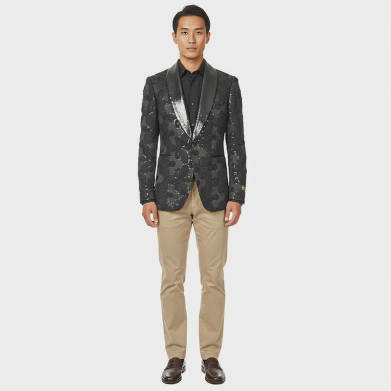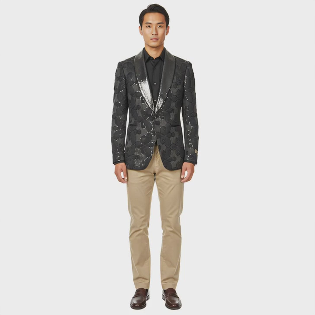 Turn heads with the Empire™ Textured Floral Dinner Jacket — a striking fusion of classic black sophistication and luxurious detailing. Featuring raised paisley embroidery enhanced with subtle sequins, this jacket delivers an elegant shimmer that catches the light with every movement. The shimmer satin shawl lapel and single-button closure complete its refined silhouette, perfect for galas, weddings, or evening events where confidence and style meet.