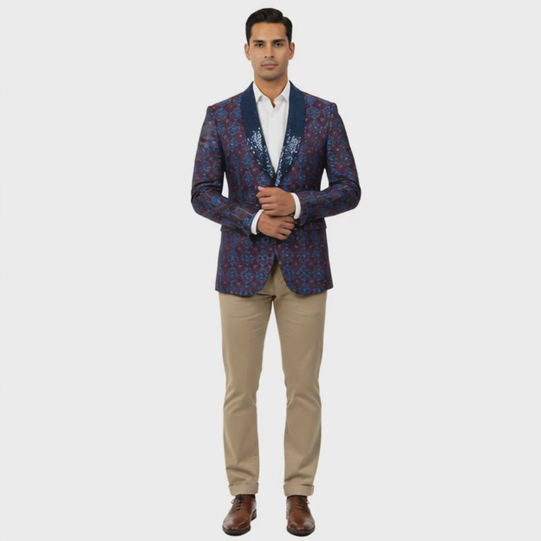Turn every entrance into a statement with this Empire™ Exclusive Blazer, a masterpiece of modern sophistication and fearless design. Featuring a shimmering sequin-textured shawl collar and a striking blue and red tile floral pattern, this piece radiates confidence and individuality. The Hybrid Fit offers the perfect balance between slim precision and modern comfort, sculpting a refined silhouette for any upscale occasion.