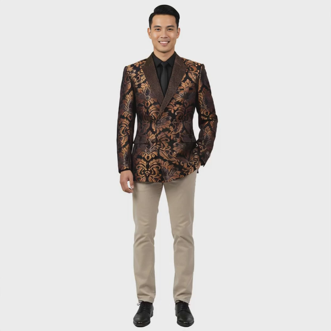 Empire™ Metallic Rust Floral Double-Breasted Hybrid Fit Blazer, Black & Rust Brocade