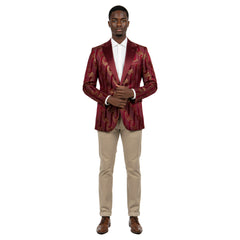 Make a bold entrance with this Empire™ metallic brocade blazer, featuring a rich burgundy base woven with gold shimmer threads in a striking wave pattern. The satin peak lapel and single-button closure create a sleek, formal profile, while the textured jacquard fabric catches the light beautifully without being glittery or velvety. A fully lined designer interior completes this show-stopping piece—perfect for red carpet events, galas, formal dinners, or upscale celebrations.