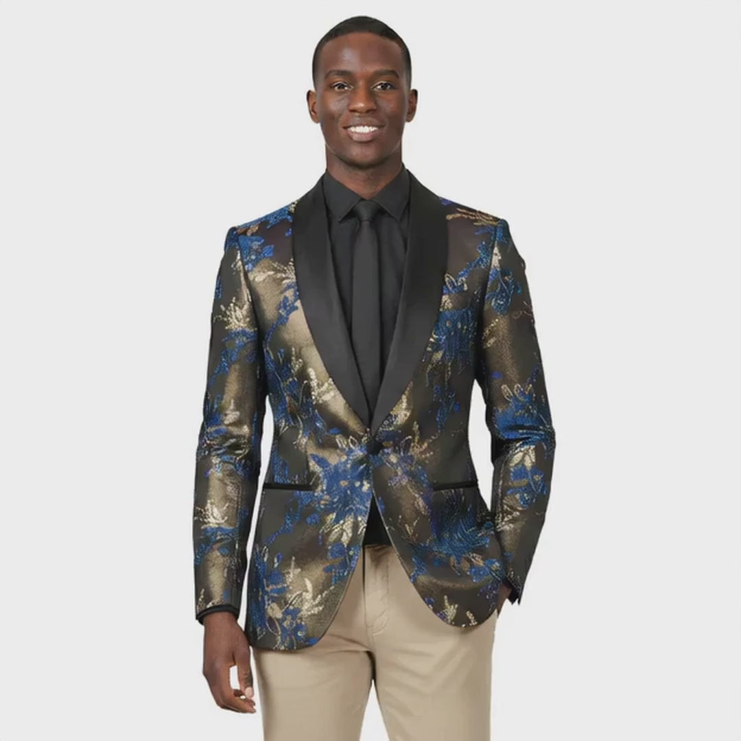 Empire™ Series Mens Blazer Hybrid-Fit Floral, Shawl Collar, Blue and Gold