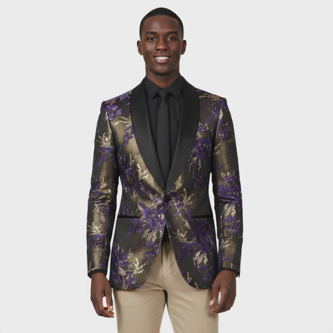 Empire™ Series Mens Blazer Hybrid-Fit Floral, Shawl Collar, Purple and Gold