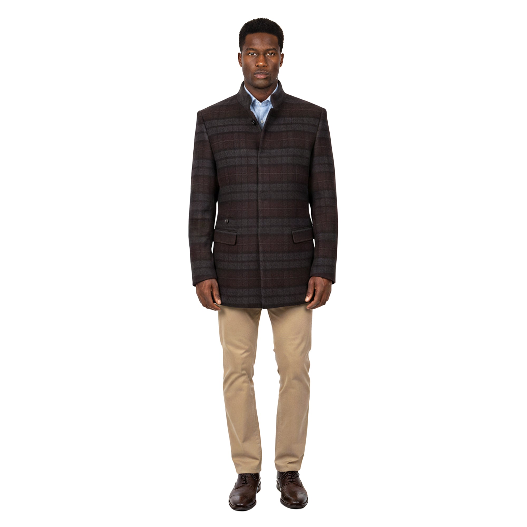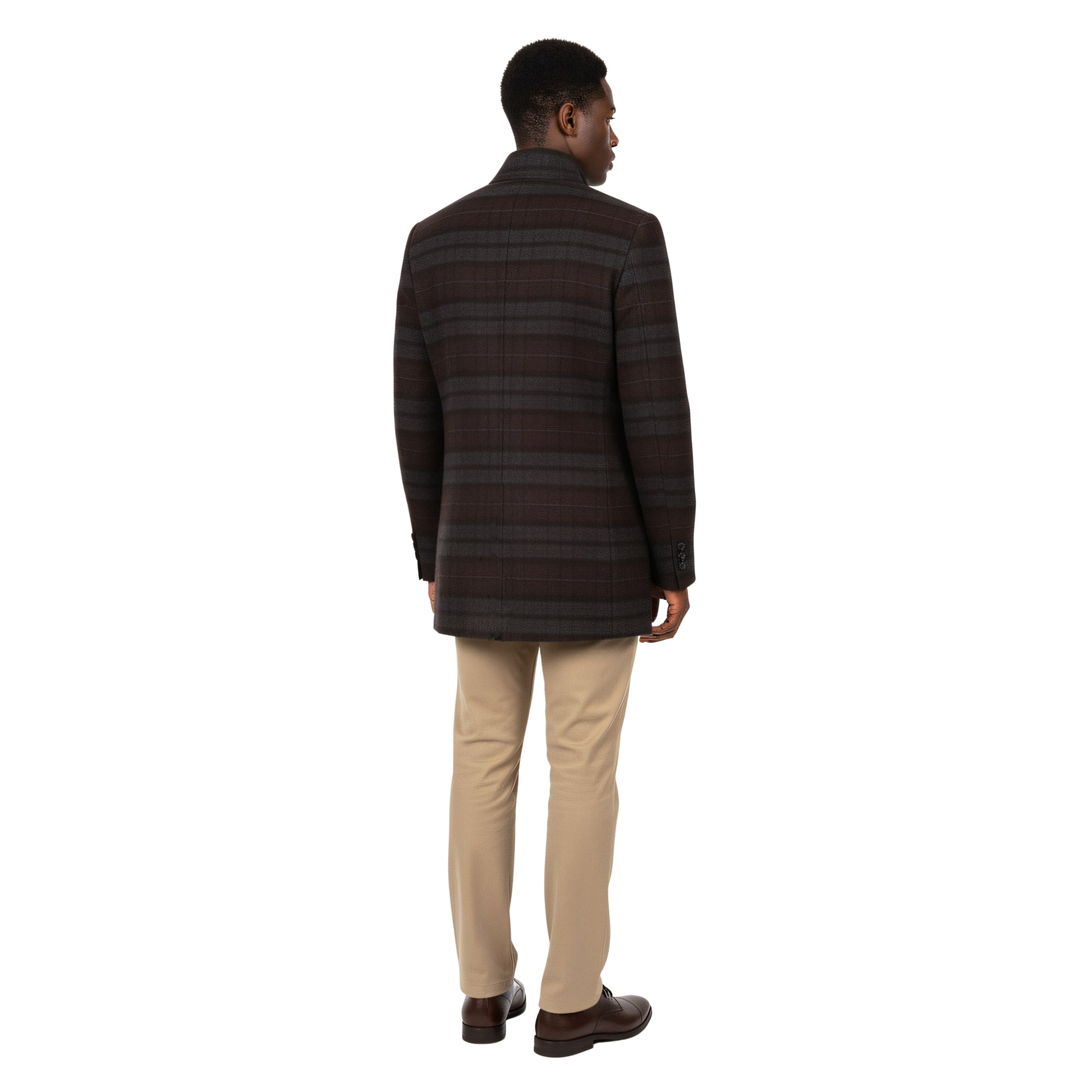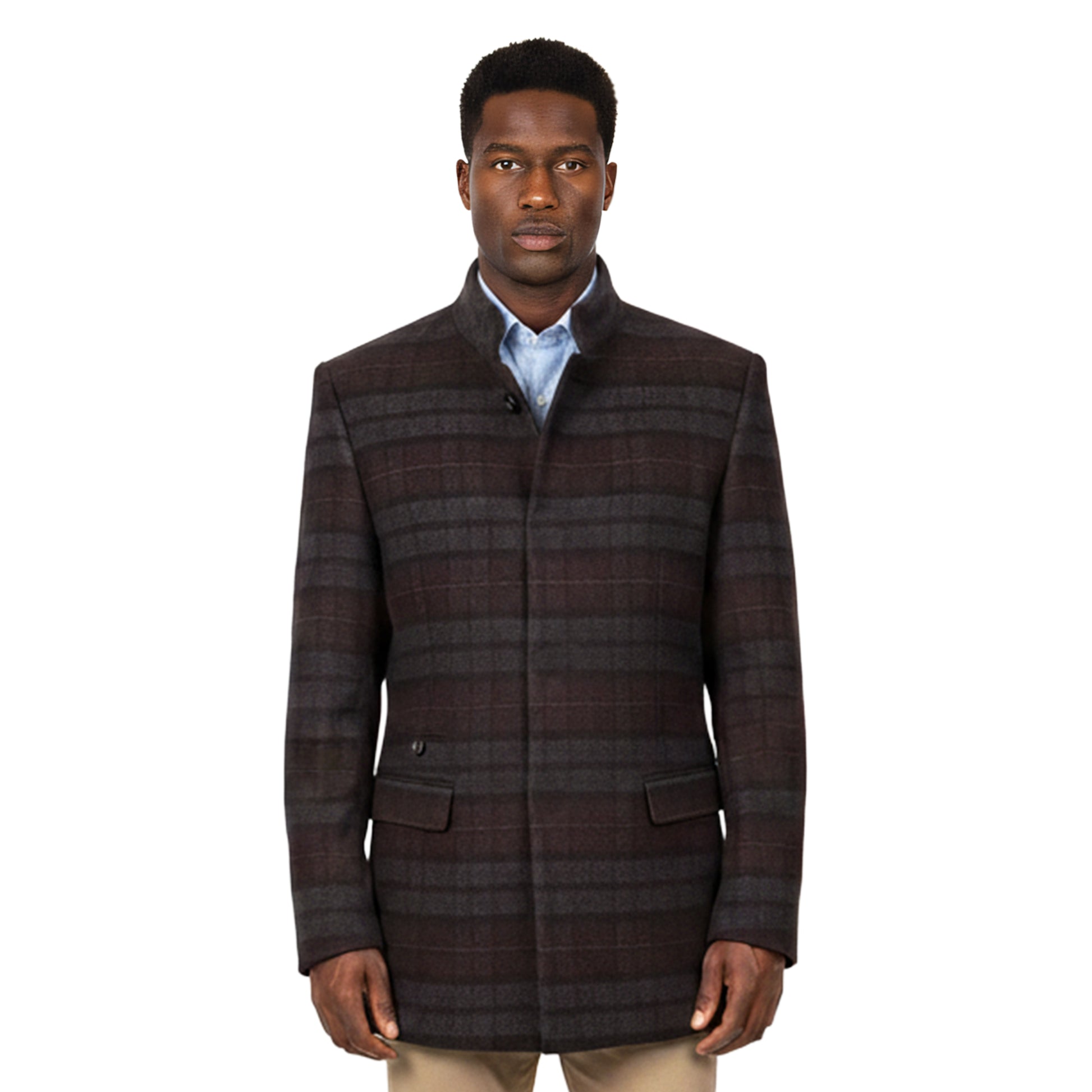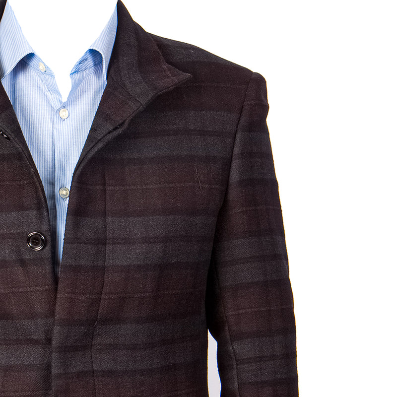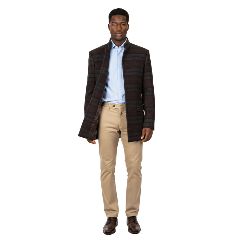 This modern topcoat features a smooth tailored silhouette and a subtle tonal plaid pattern that adds depth without overwhelming the look. Designed for versatility, it layers effortlessly over dress shirts, sweaters, or suiting while maintaining a clean and polished finish. Its structured shape and refined detailing make it a reliable choice for work, evenings out, and seasonal occasions.