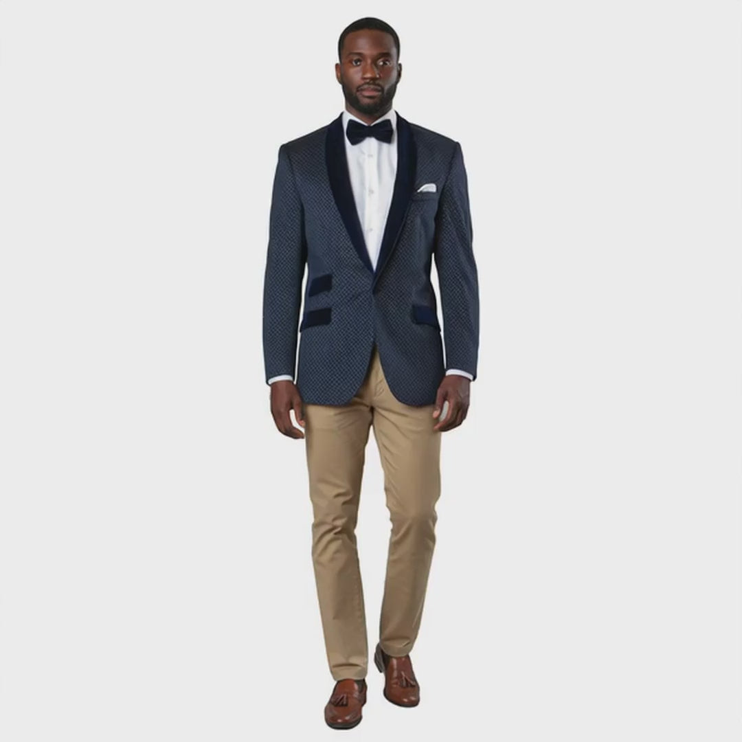 This tuxedo jacket brings together a luxurious velvet shawl lapel and a refined geometric honeycomb jacquard weave, creating a standout formal look with depth and dimension. The detailed pattern elevates the fabric without overwhelming it, while the smooth velvet accents add a polished eveningwear finish. Designed with modern tailoring, this jacket delivers a sophisticated presence perfect for galas, weddings, performances, and any upscale event.