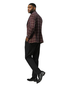 The Plaid Burgundy Jacket effortlessly combines classic style with a modern twist. The rich burgundy plaid pattern adds a bold yet sophisticated touch, perfect for making a statement at any formal or semi-formal occasion. Designed with a hybrid fit, it offers a tailored silhouette that ensures both comfort and elegance. The notch lapel and two-button closure create a timeless aesthetic, while side vents and underarm sweat guards provide practicality and ease of movement. Finished with interior French facing and ample pocket space, this jacket is a refined choice for the contemporary gentleman.