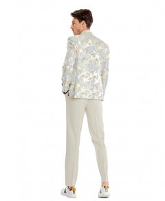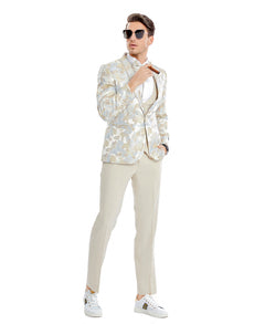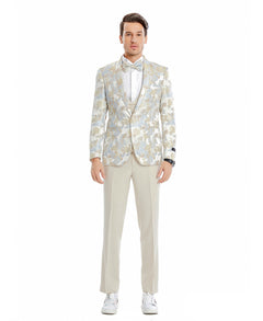 Step into style with the Tazio Tan floral-patterned 3-piece skinny suit, perfect for making a statement at homecoming, winter formal, or Quinceañeras. The jacket, with its classy shawl lapel, single-breasted fit, and handy pockets, keeps you looking sharp and feeling comfortable. The double-breasted vest adds a touch of texture with an adjustable back strap for the perfect fit. The skinny-fit pants round off the look with their sleek design and practical pockets. You'll always be dressed to impress in this stylish suit!